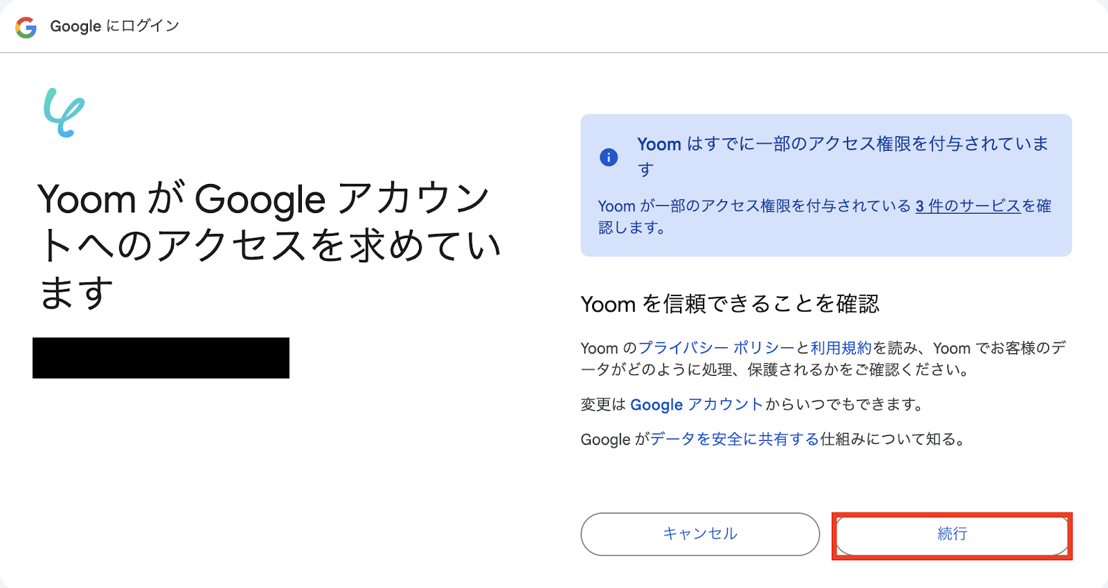 アクセス権限付与の画面が表示されたら、内容を確認し「続行」をクリックします。