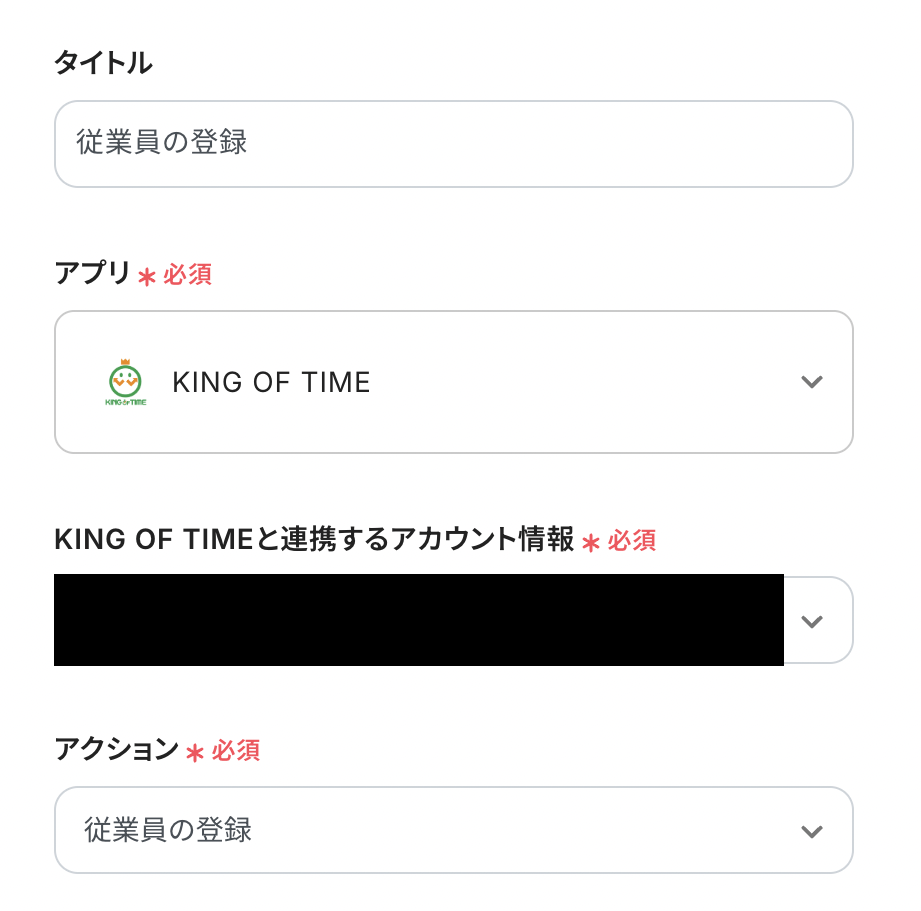 ②+マークからアプリと連携するオペレーションを選択し、KING OF TIMEを選択して以下の設定を行いテスト・保存してください。