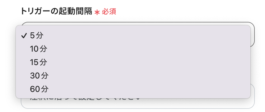 「トリガーの起動間隔」を5分・10分・15分・30分・60分から選択します。