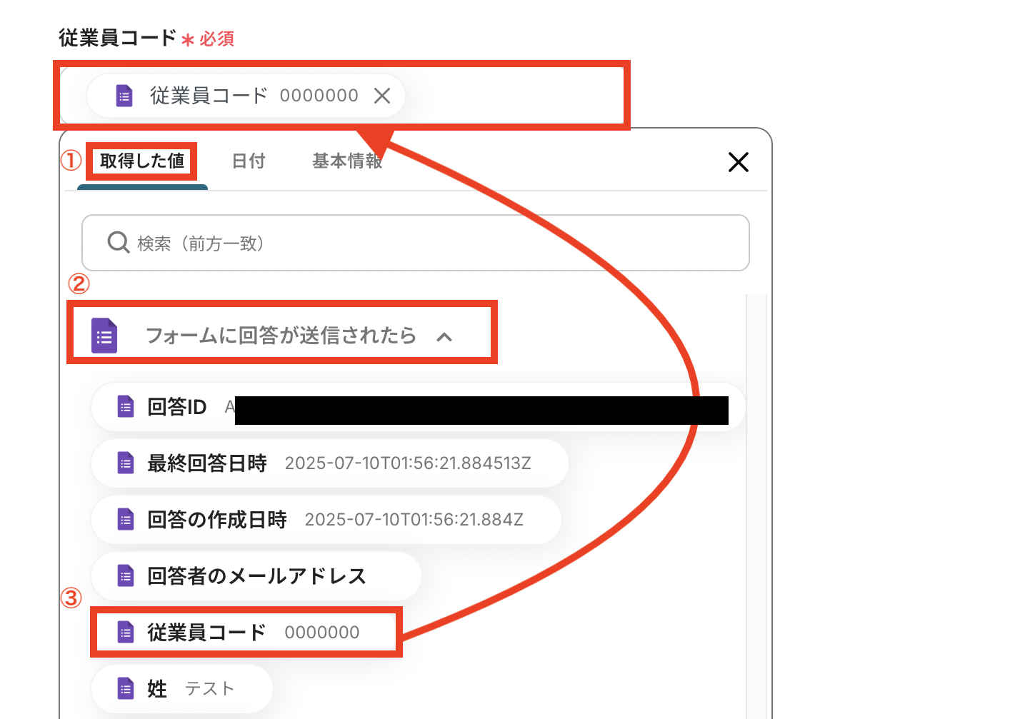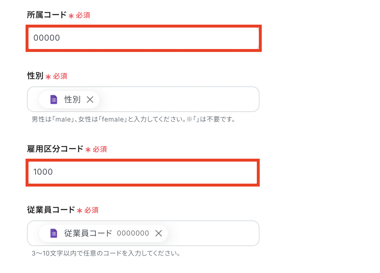 「性別」や「従業員コード」はステップ3で取得した、Googleフォームの回答内容を埋め込みます。