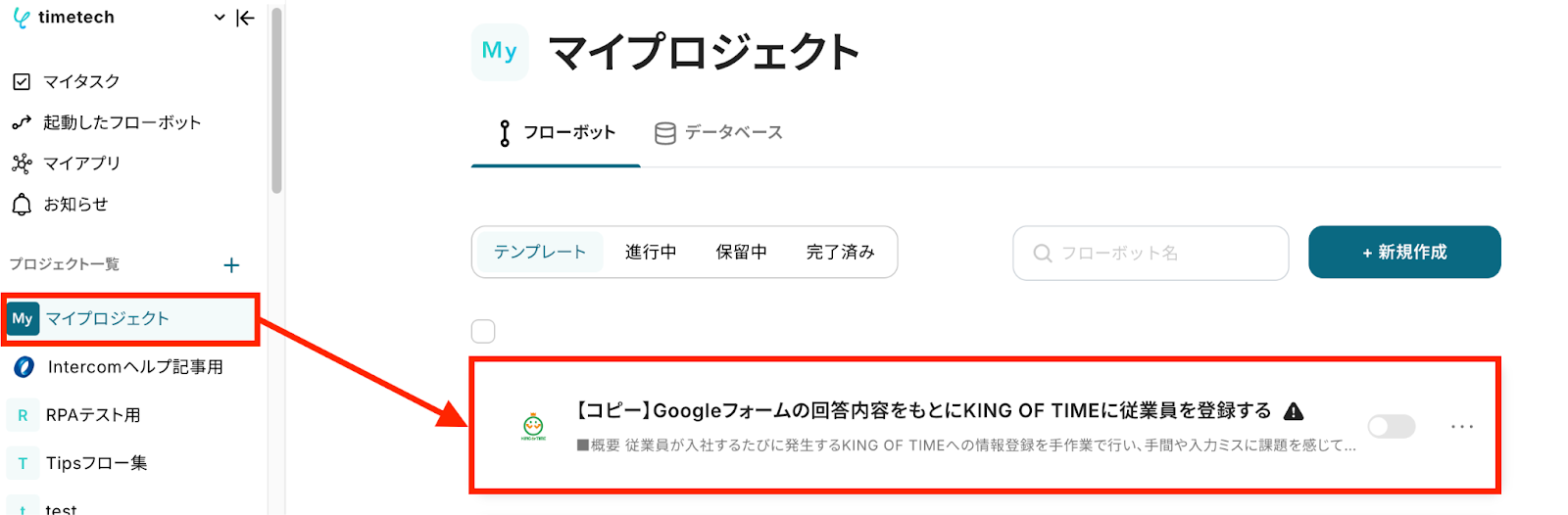 左側にあるメニューの「マイプロジェクト」から、コピーしたテンプレートを開きます。