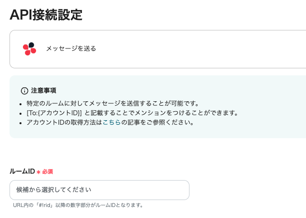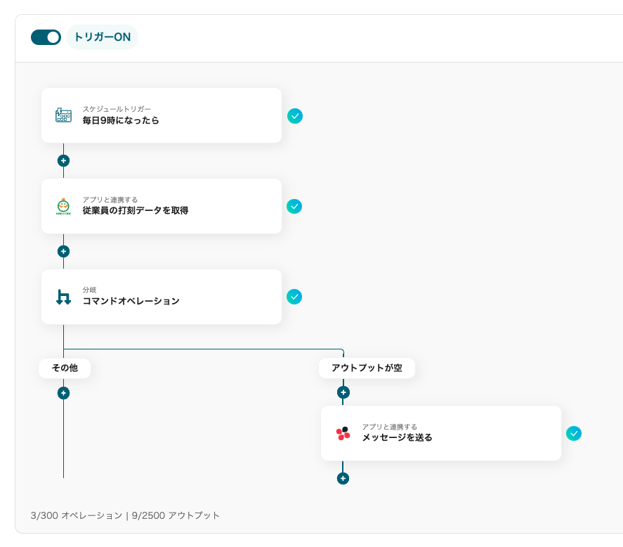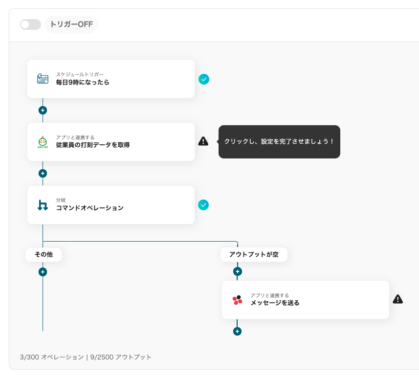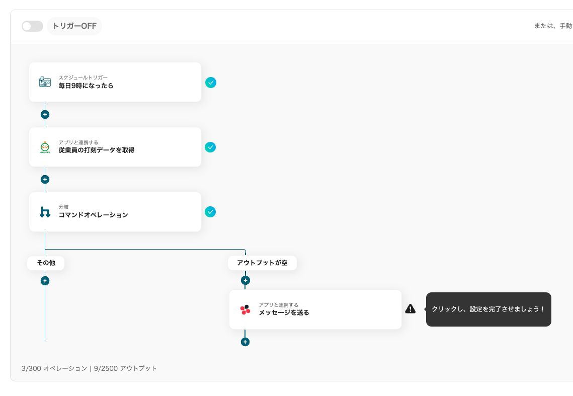 こちらでは打刻ができていなかった場合の定型文を作成しChatworkに送る設定を行います。