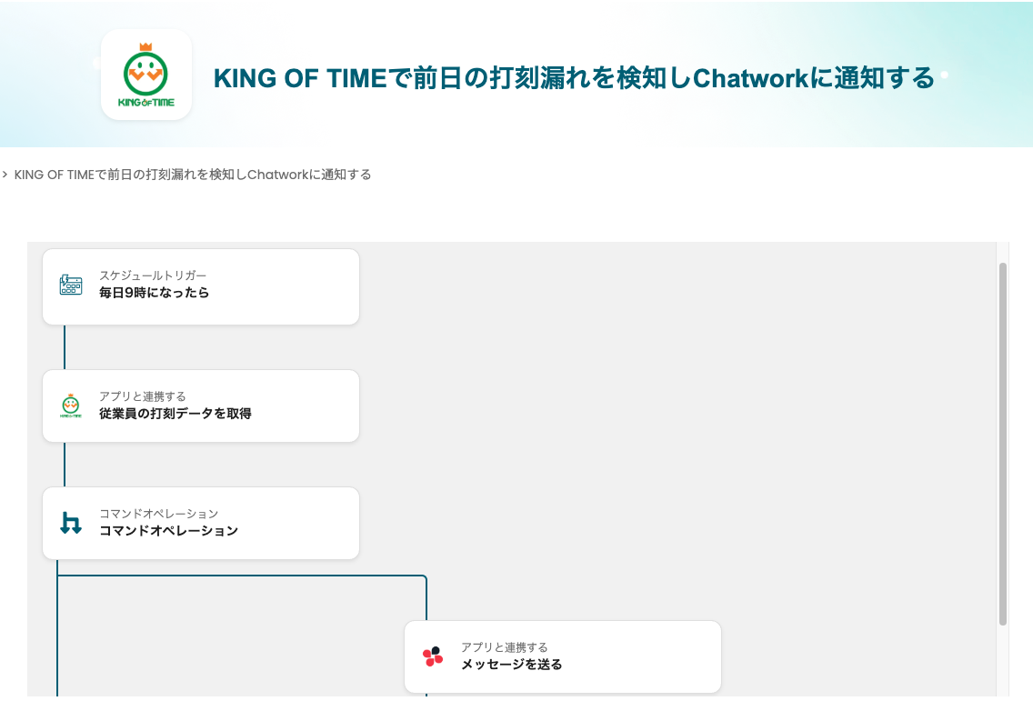 Chatworkに特定のワードが投稿されると、KING OF TIMEから前日の日別勤怠データを取得し、自動でChatworkに通知します。これにより、手作業を省き、必要な情報を迅速に共有できます。