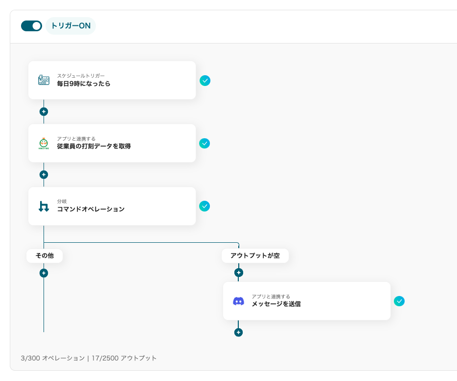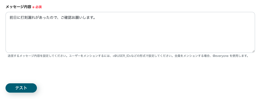 こちらでは打刻ができていなかった場合の定型文を作成しDiscordに送る設定を行います。
