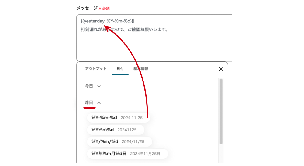 送信するメッセージの定型文を作ります。編集欄をクリックすると、日付の引用コードを選択できます。また、グループに通知する場合は、メンションを設定するとより伝わりやすくなります。