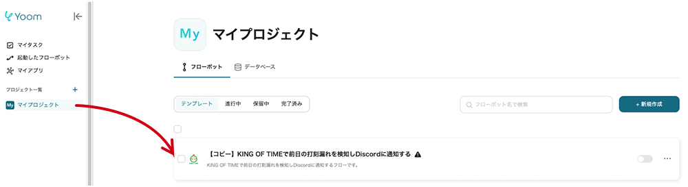 ここからは、「KING OF TIMEに情報が登録されたらDiscordに通知する」自動化の設定方法を、Yoomのフローボットテンプレートを使って解説します。