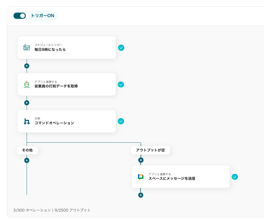 この工程では、前日の打刻の有無によって通知に進むかどうかを判断します。
