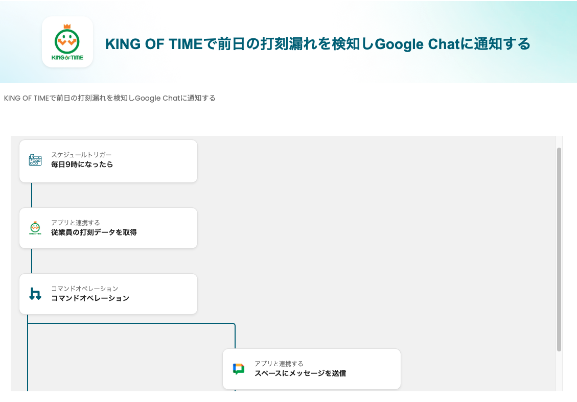 KING OF TIMEで前日の打刻漏れを検知しGoogle Chatに通知するフローです。