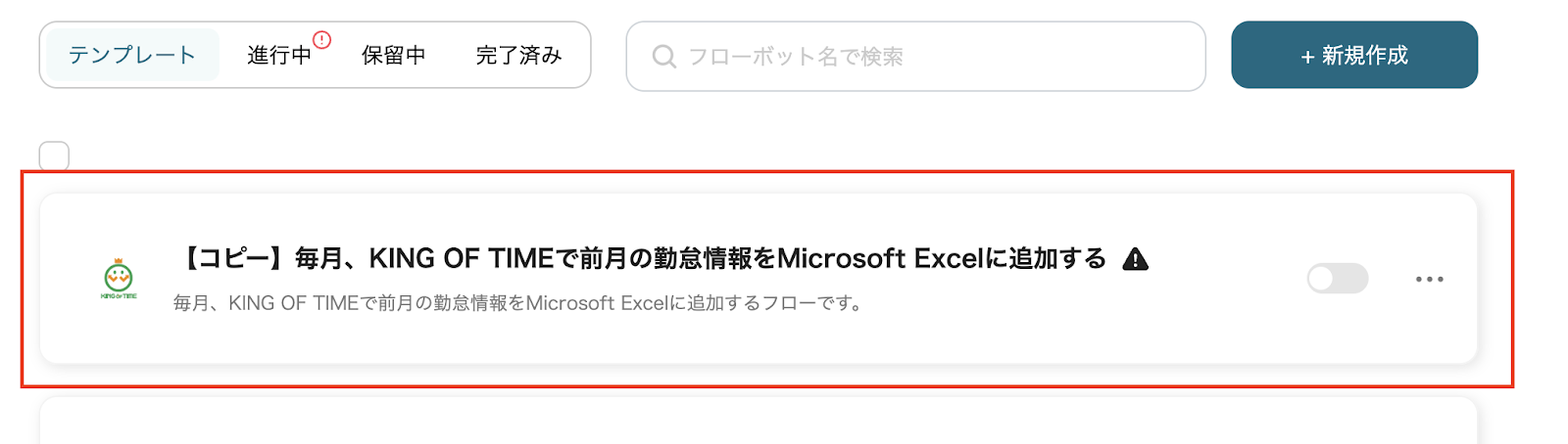 それでは、「毎月、KING OF TIMEで前月の勤怠情報をMicrosoft Excelに追加する」のテンプレートを使ったフローボットを作成していきましょう。