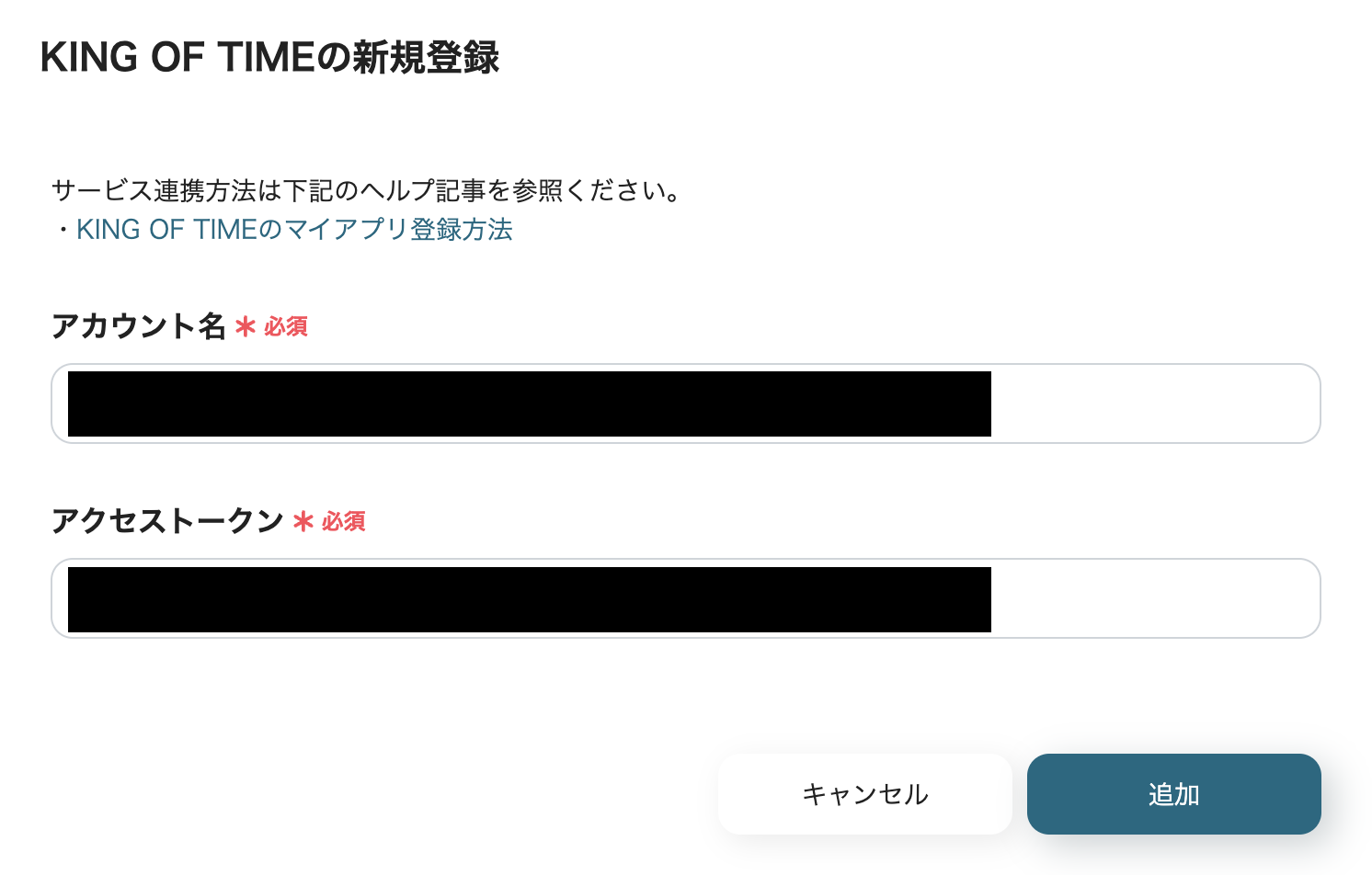(2)表示されている内容に沿って、「アカウント名」、「アクセストークン」を入力し、[追加]をクリックします。