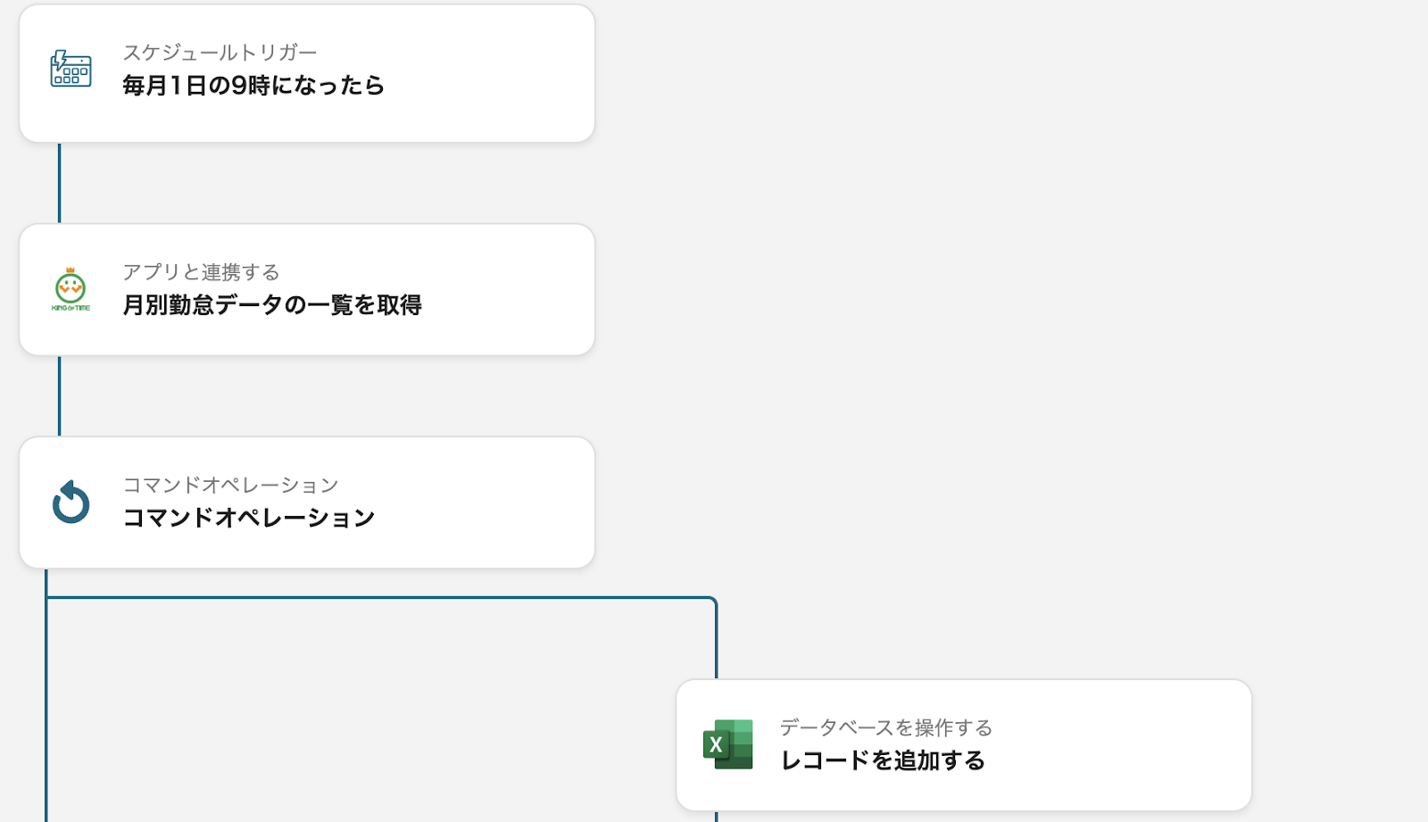 毎月、KING OF TIMEで前月の勤怠情報をMicrosoft Excelに追加するフローです。