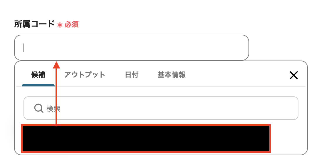 (4)「所属コード」は、以下の画面のように入力バーをクリックすると、アカウント情報に基づいた内容が『候補』として展開されますので、その情報を引用できます。