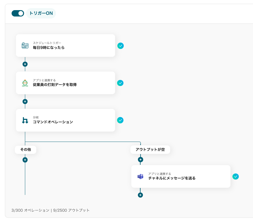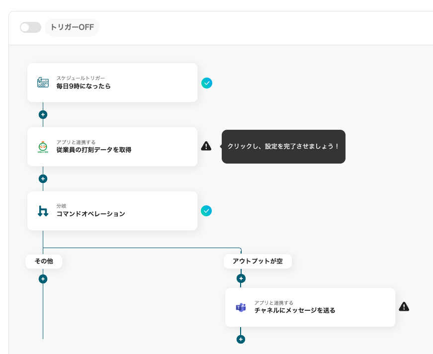 この工程では、前日の打刻の有無によって通知に進むかどうかを判断します。
