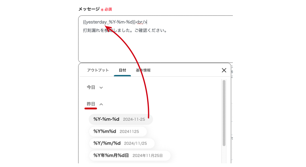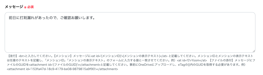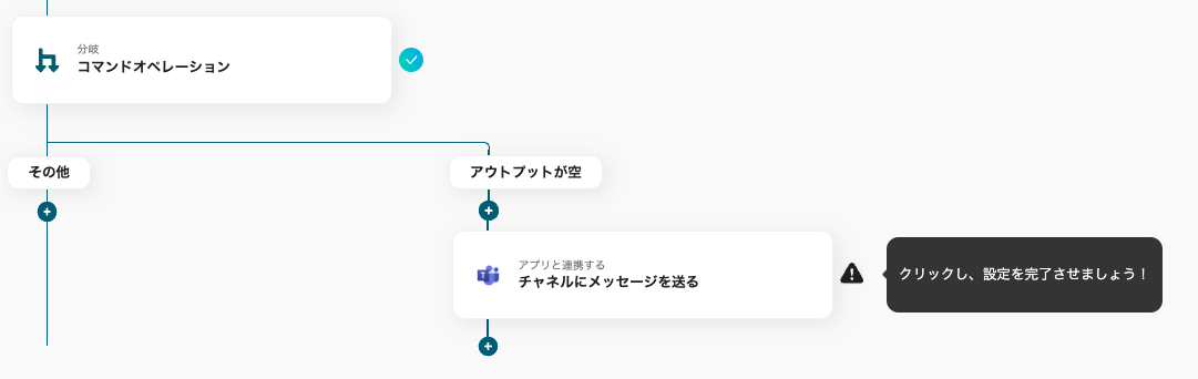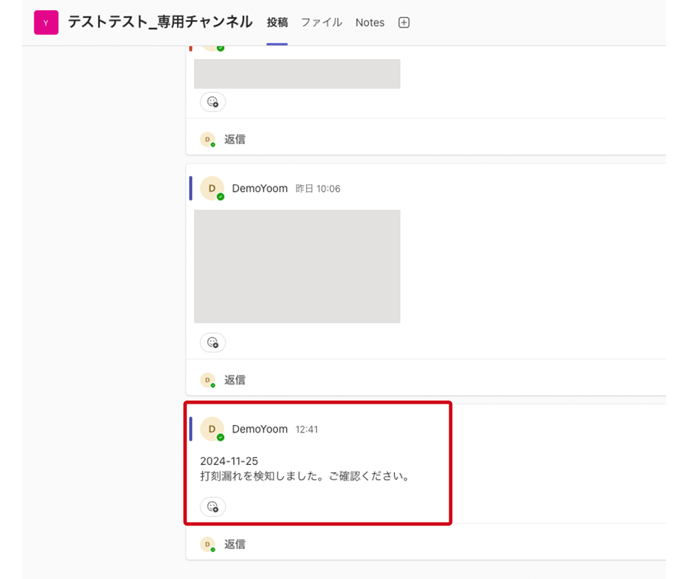 こちらでは打刻ができていなかった場合の定型文を作成しMicrosoft Teamsに送る設定を行います。
