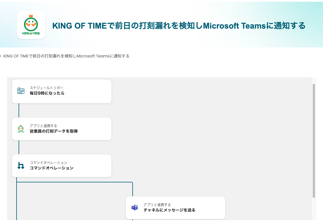 KING OF TIMEとMicrosoft Teamsと連携させると、前日の打刻漏れを自動で検知して通知することができます!従来、このような仕組みを構築するにはプログラミングが必要でしたが、ここではノーコードで連携する方法を解説します。