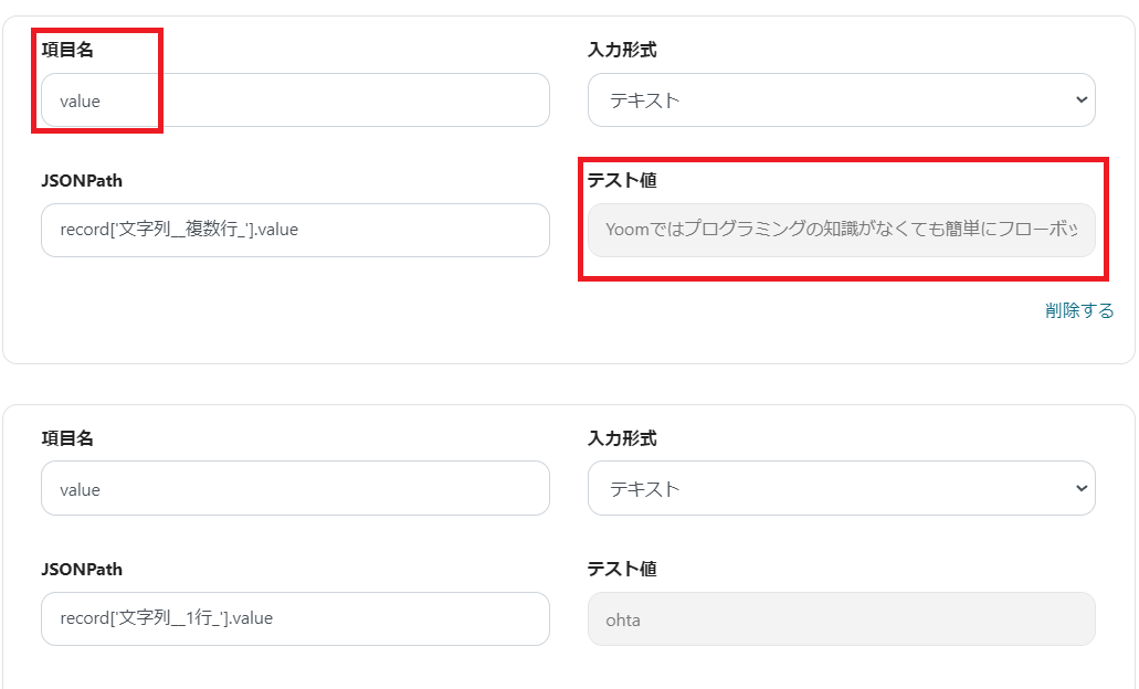 ポイントとして、テスト値の内容に等しい項目名にしたほうが後でわかりやすいです。