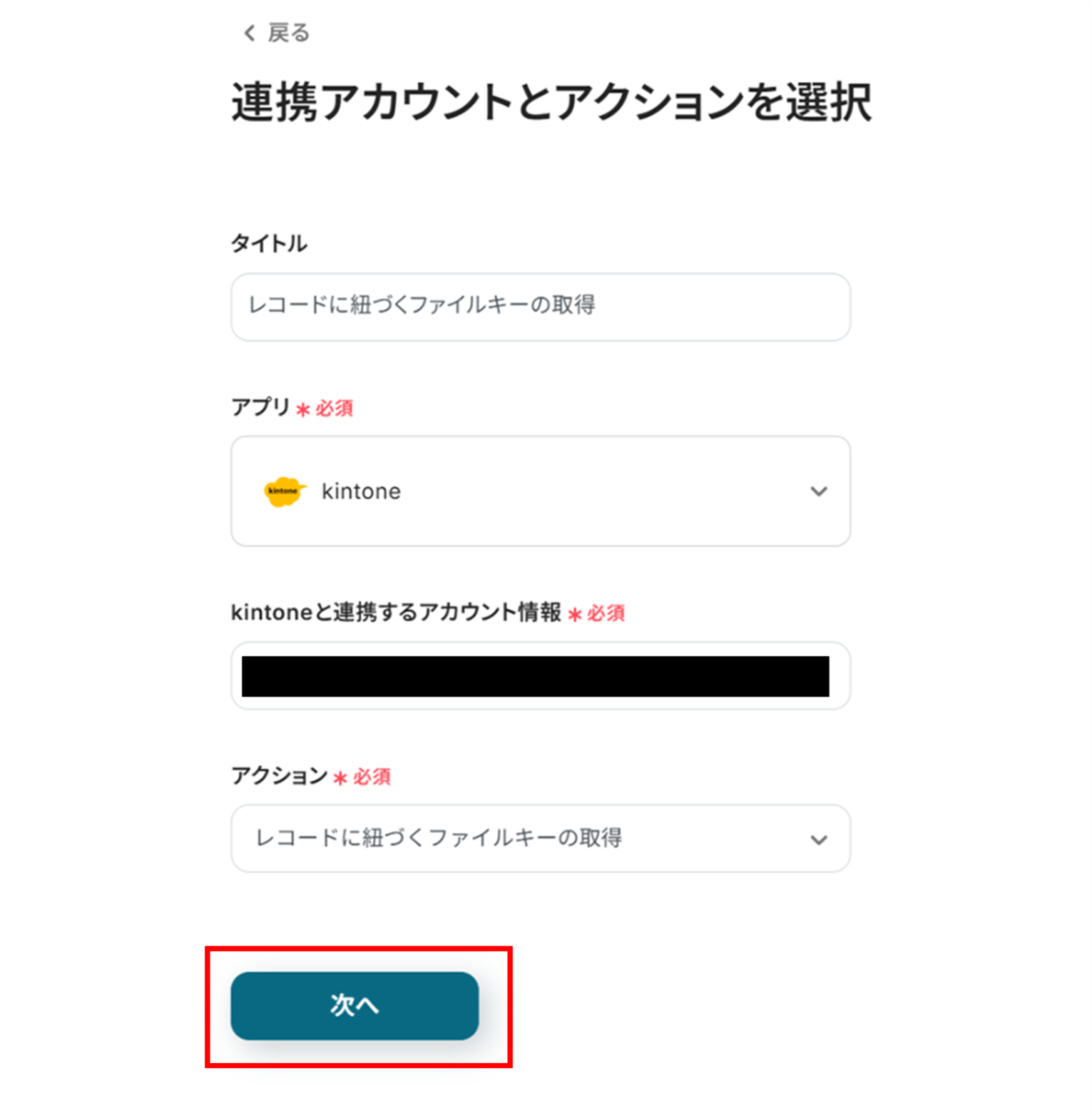 (2)kintoneの「連携アカウントとアクションを選択」画面から、kintoneと連携するアカウント情報に誤りがないかを確認し、アクションは「レコードに紐づくファイルキーの取得」のままで「次へ」をクリックします。