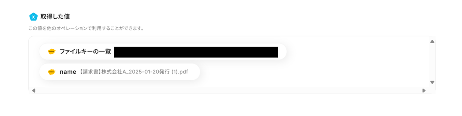 テストに成功すると、取得した値に「ファイルキーの一覧」が反映されます。