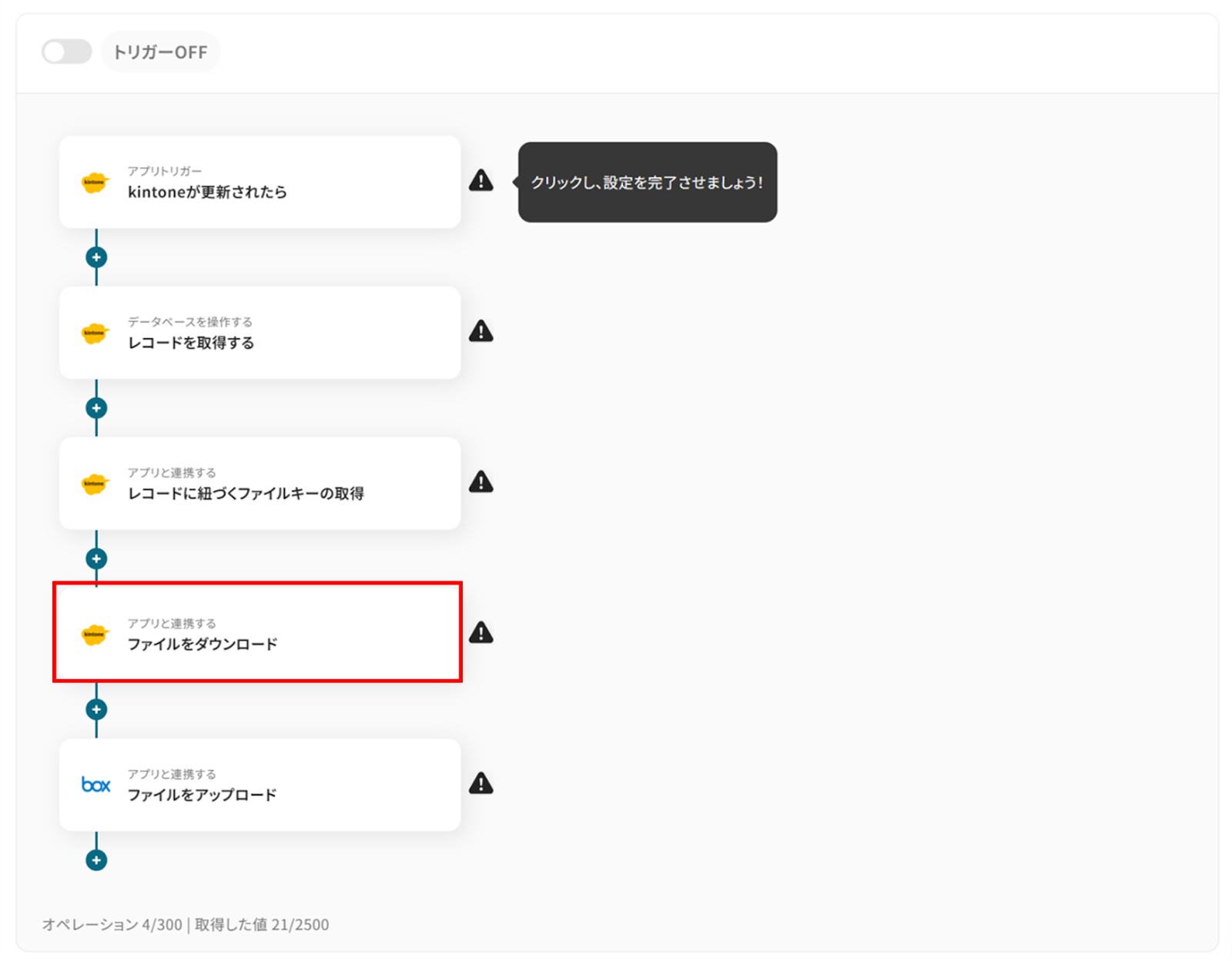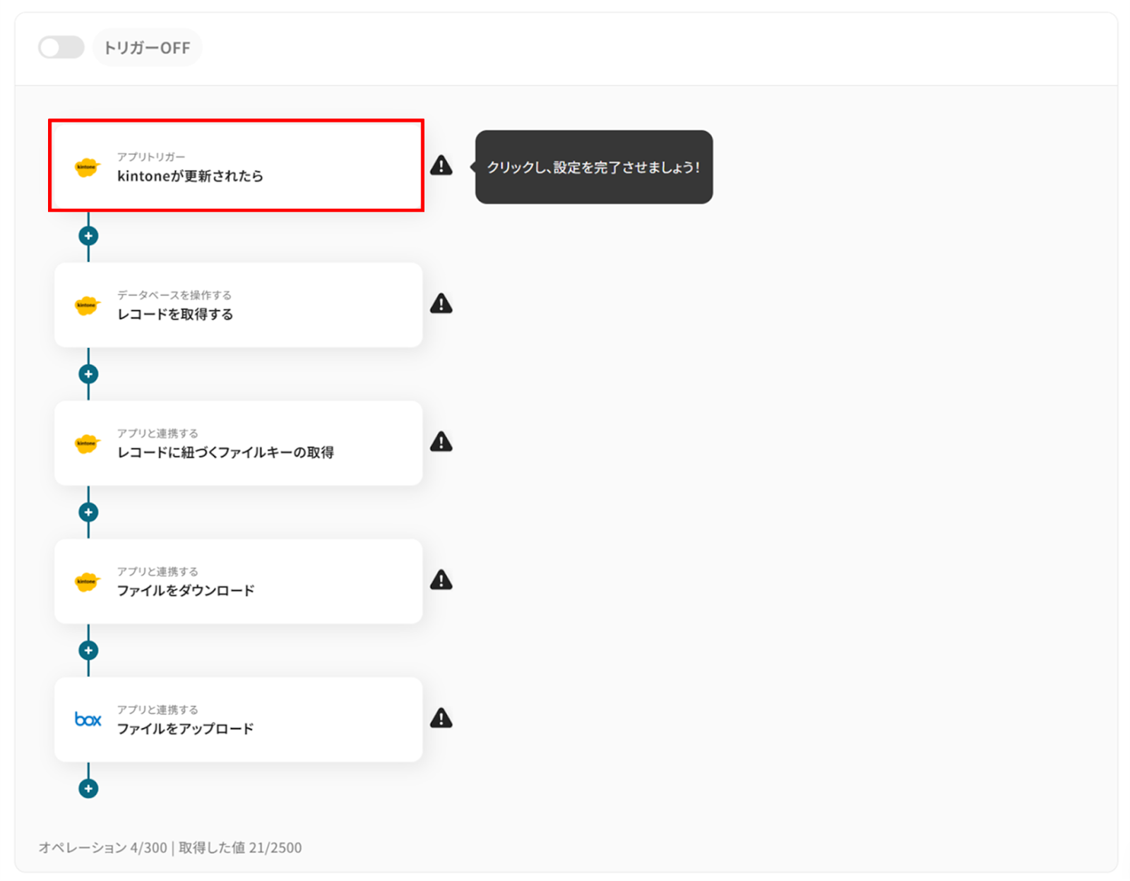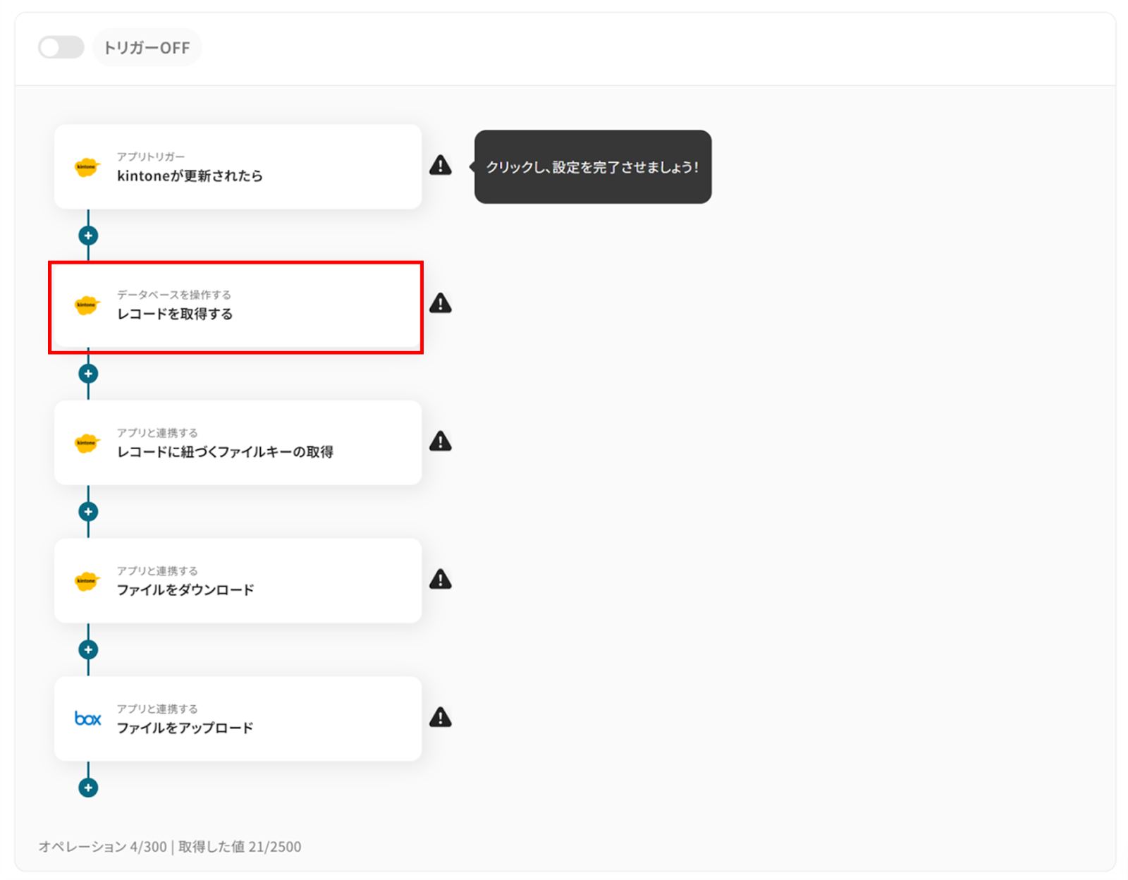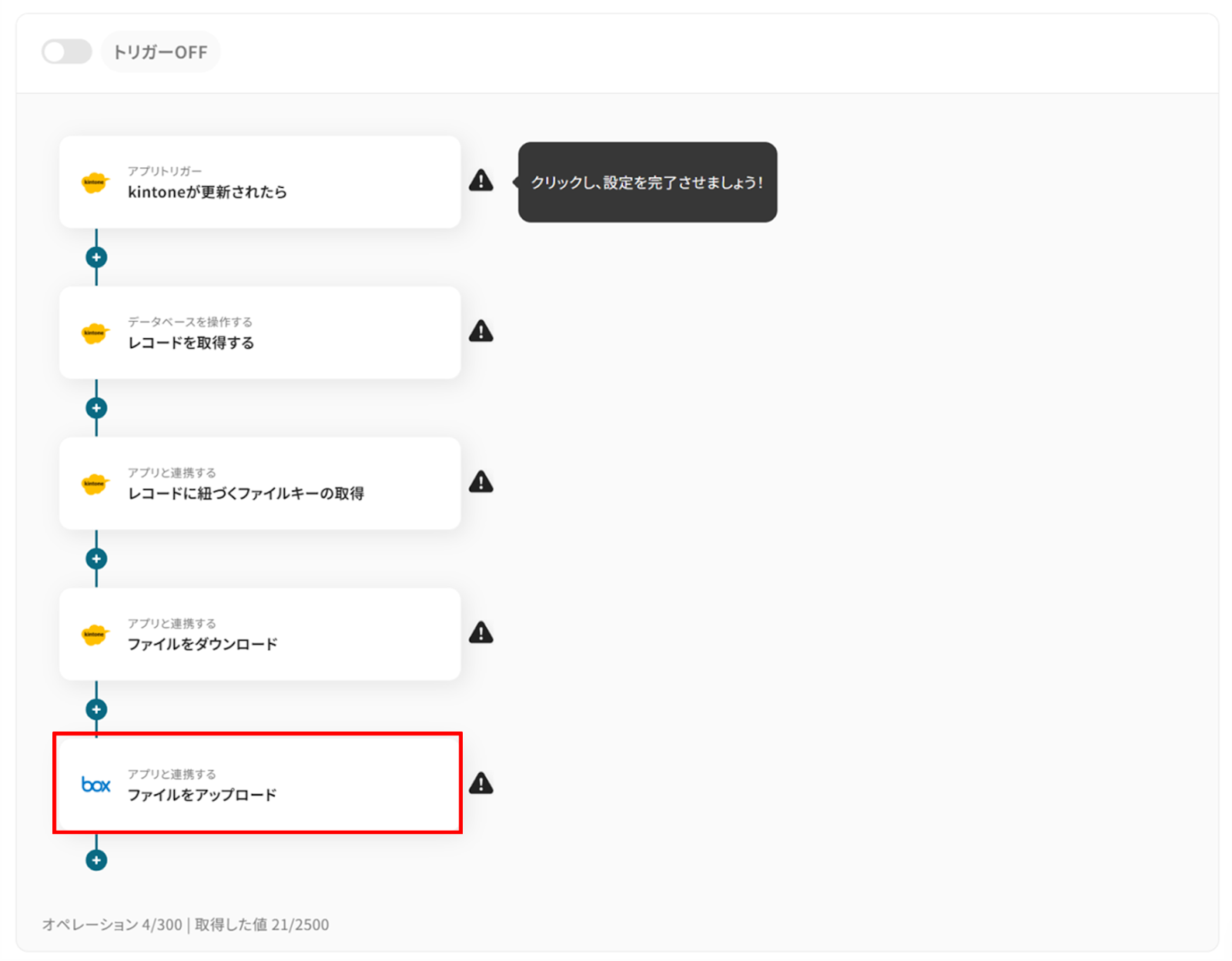 kintoneでレコードが更新されたら、Boxにファイルをアップロードするフローです。