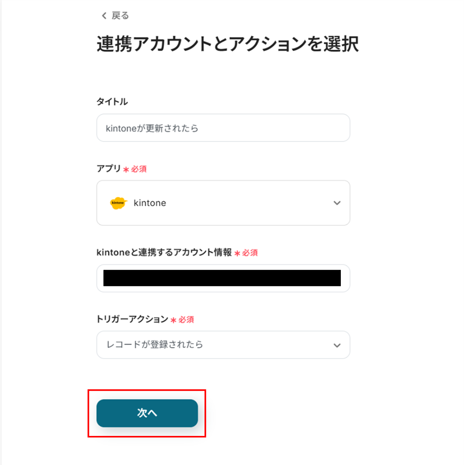 (2)kintoneの「連携アカウントとアクションを選択」画面から、kintoneと連携するアカウント情報に誤りがないかを確認し、トリガーアクションは「レコードが登録されたら」のままで「次へ」をクリックします。