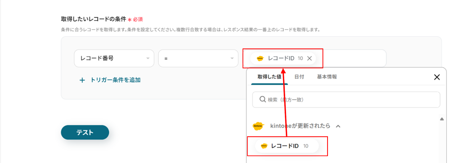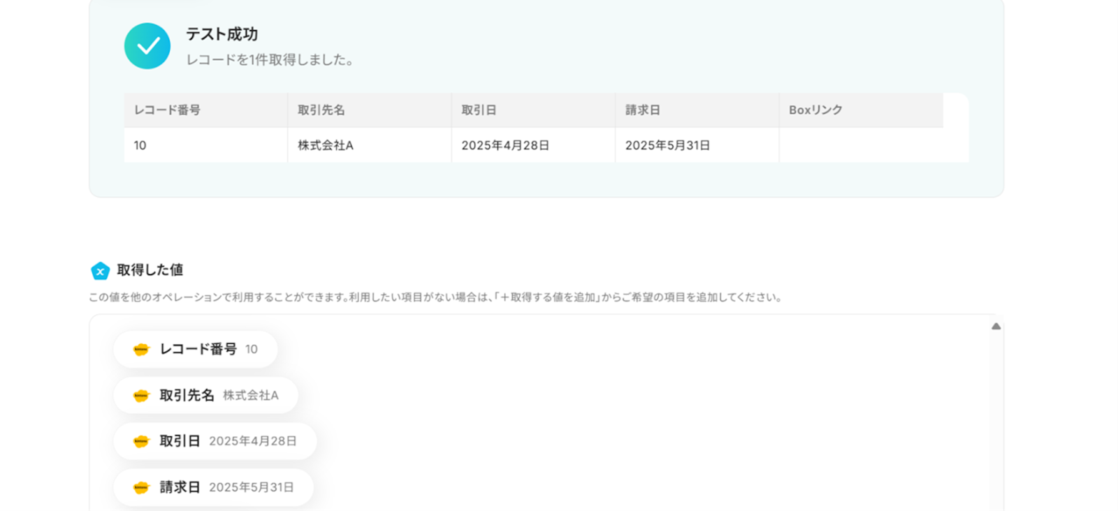 テストに成功すると、レコードIDを基にさらにkintoneの情報を取得できました!