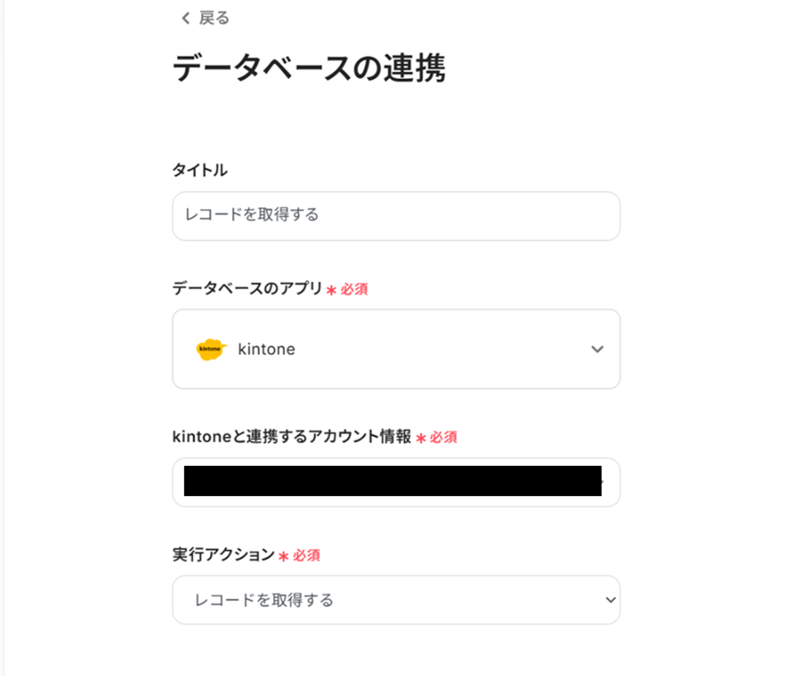 (2)kintoneの「データベースの連携」画面から、kintoneと連携するアカウント情報に誤りがないかを確認し、実行アクションは「レコードを取得する」のままで「次へ」をクリックします。