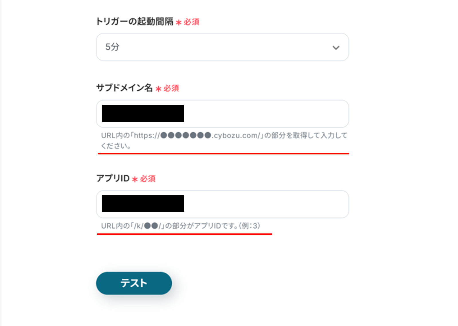 下へ進み、「サブドメイン名」は連携するkintoneURL内の「https://●●●●●●●.cybozu.com/」の、「●●●●●●●」部分を取得して入力してください。