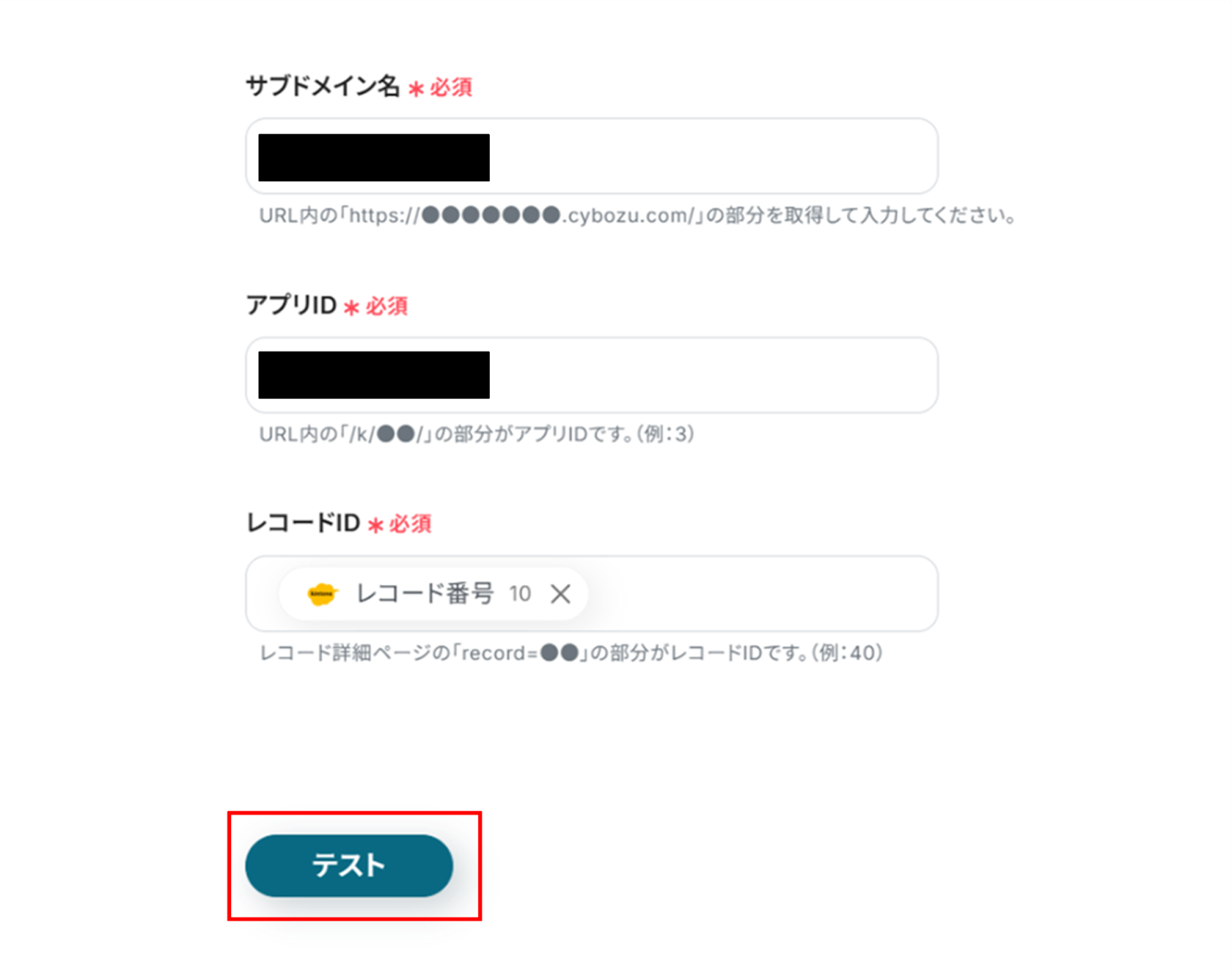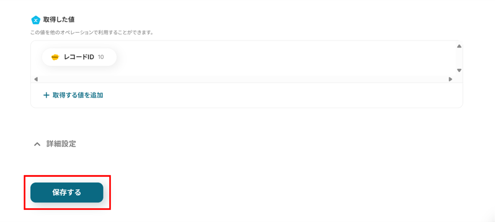 ・レコードID:④で取得したレコードIDを埋め込みます。