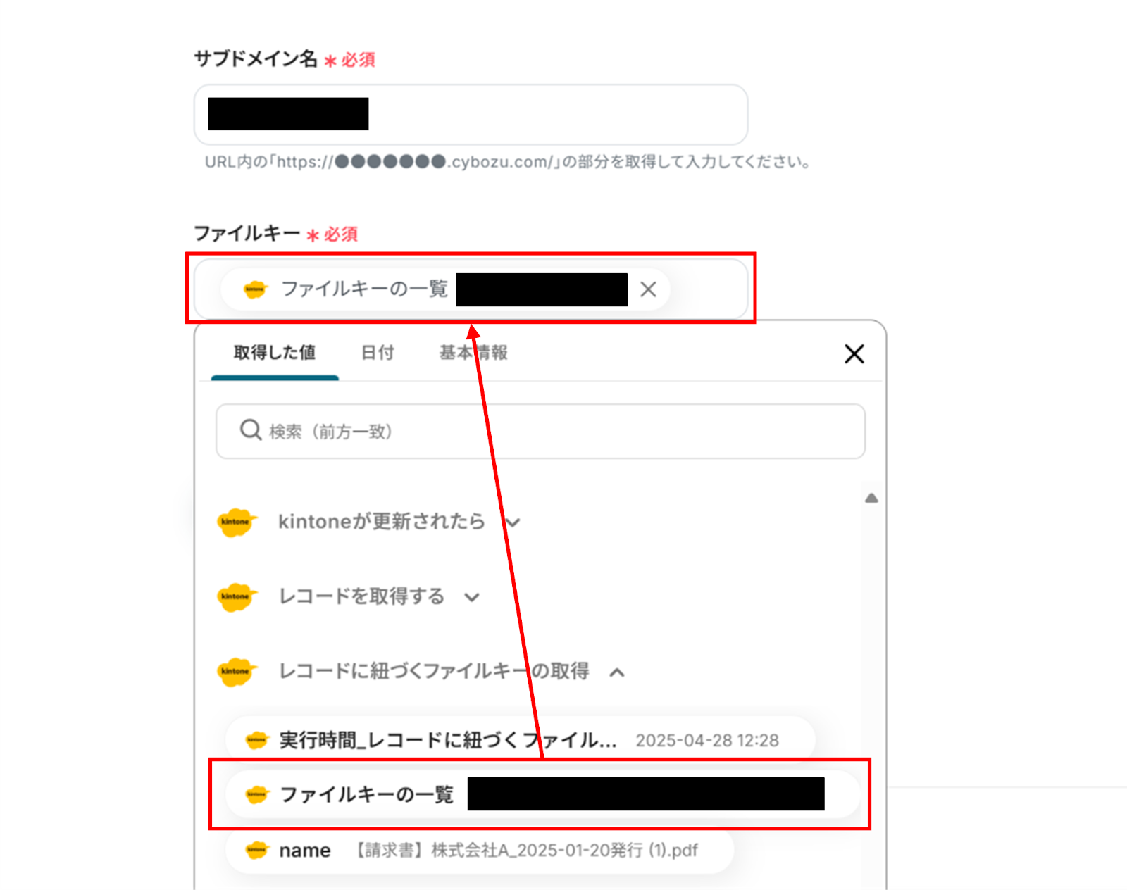ステップ5:kintoneと連携し、レコードに紐づくファイルキーを取得する