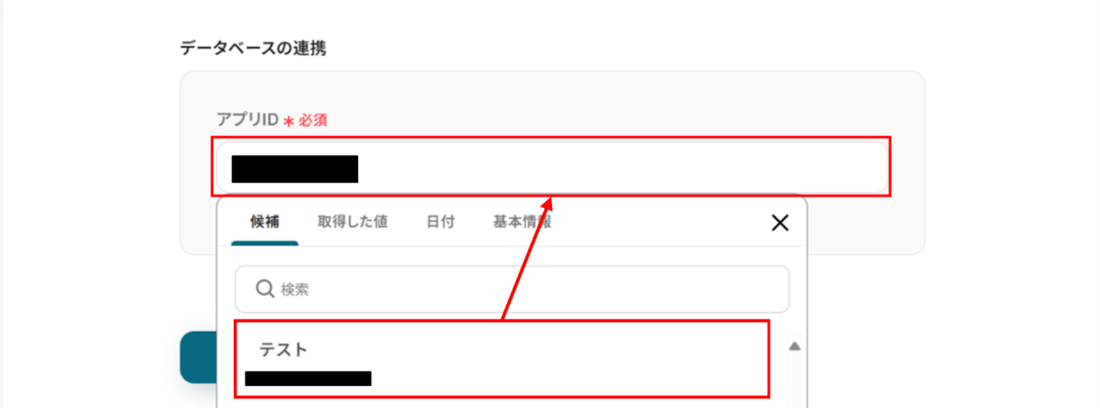 (3)「データベース操作の詳細設定」画面から、先ほど取得したkintoneの情報を「取得した値」を使って入力します。