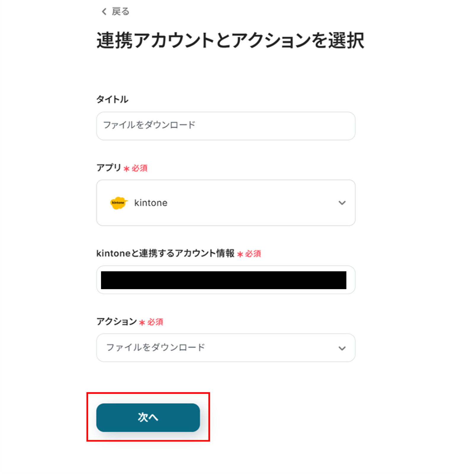 (2)kintoneの「連携アカウントとアクションを選択」」画面から、kintoneと連携するアカウント情報に誤りがないかを確認し、アクションは「ファイルをダウンロード」のままで「次へ」をクリックします。