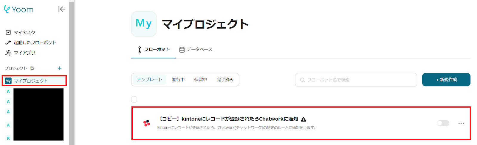 1.Yoom管理画面の「マイプロジェクト」を選択し、「【コピー】kintoneにレコードが登録されたらChatworkに通知」をクリックします。