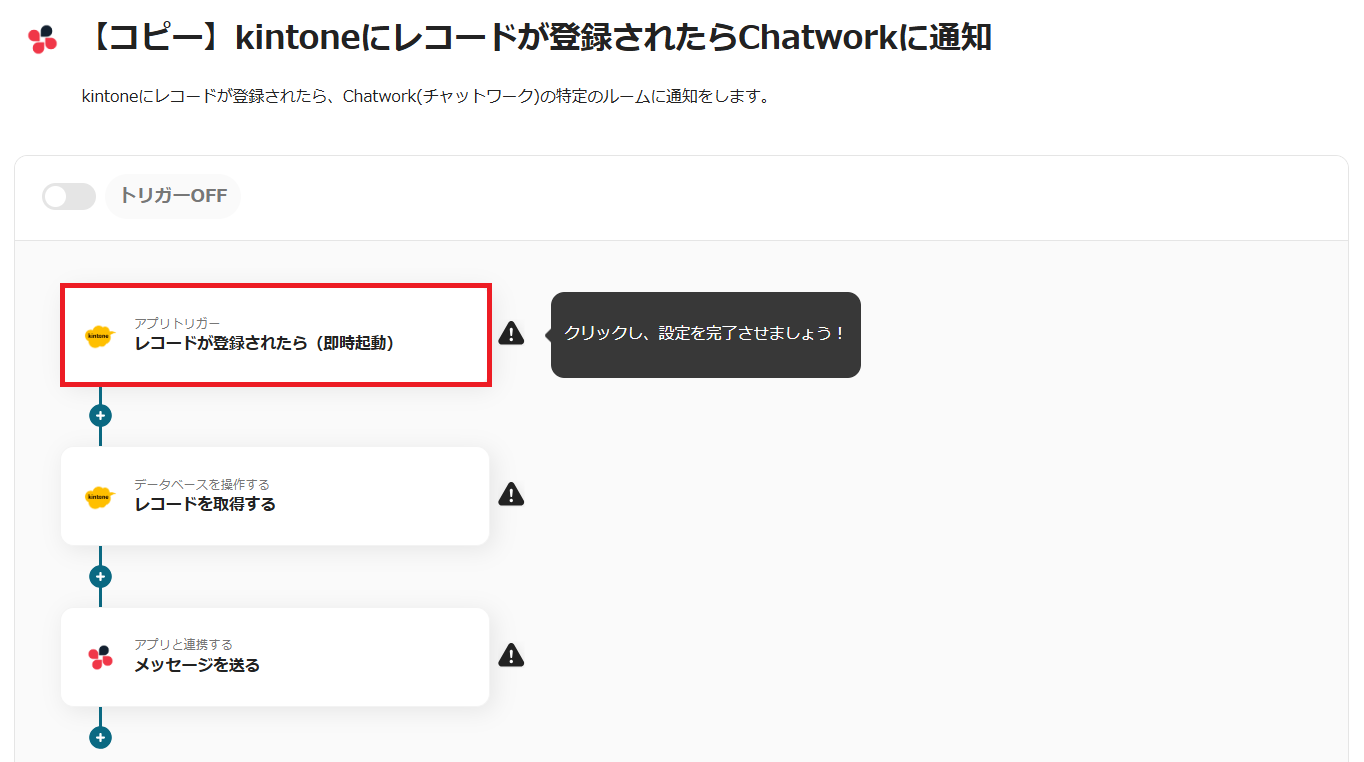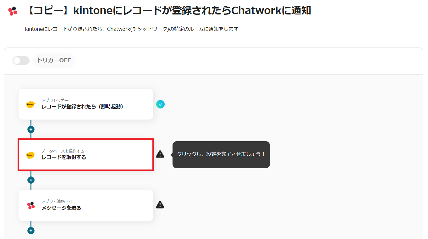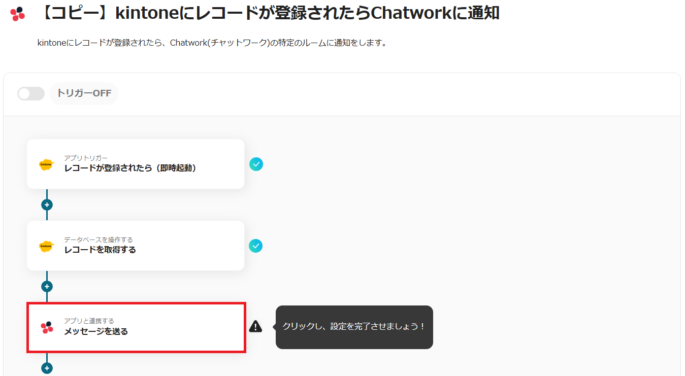 5.トリガーをONにすると、kintoneにレコードが登録されるたび、Chatworkに自動通知されます。