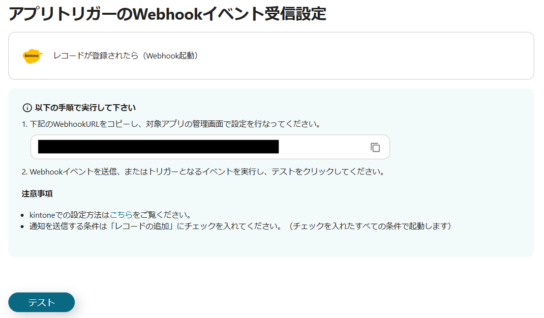 4.WebhookURLをkintoneに設定し、テストを行います。