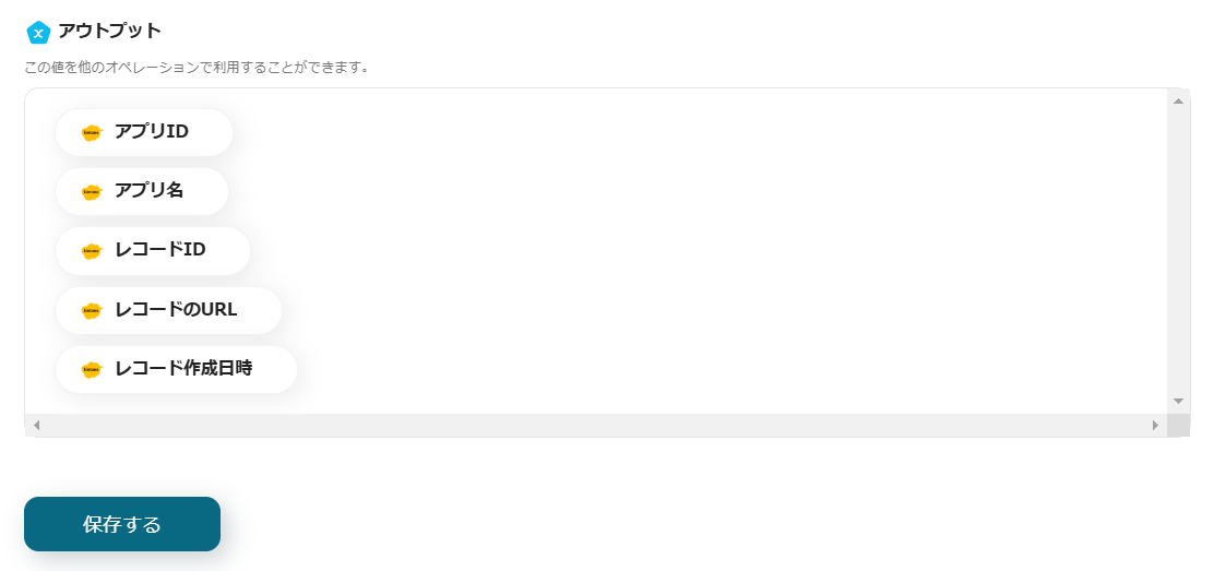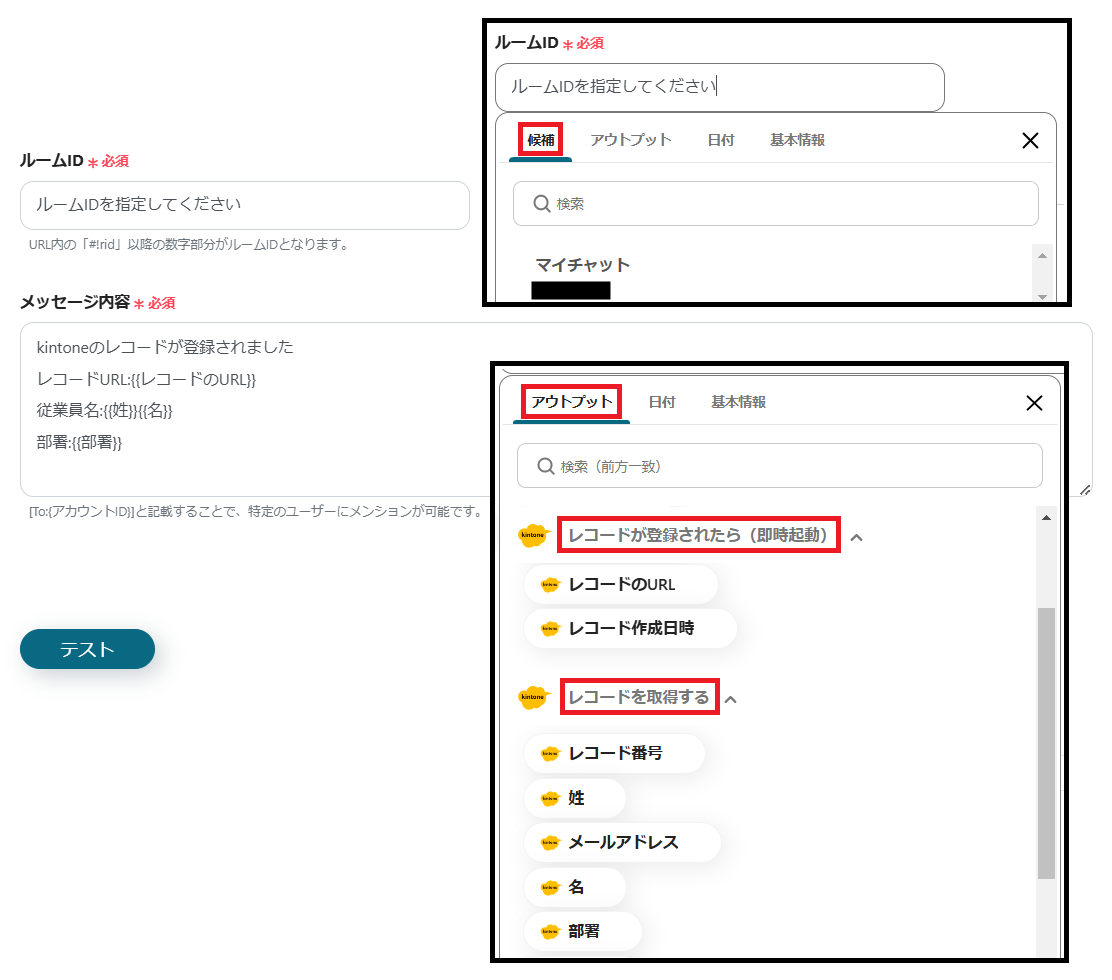 ※メッセージ内容には、定型文を直接入力できます。また、枠をクリックして表示されるアウトプットの「レコードが登録されたら(即時起動)」や「レコードを取得する」からも設定できます。(値は二重括弧で表示されます)これにより、レコードごとに変わる内容を動的に反映できます。