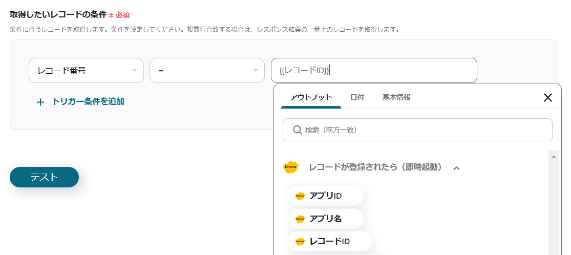 ※左枠には、レコード番号を設定します。右枠には、枠をクリックして表示されるアウトプットの「レコードが登録されたら(即時起動)」からレコードIDを設定します。