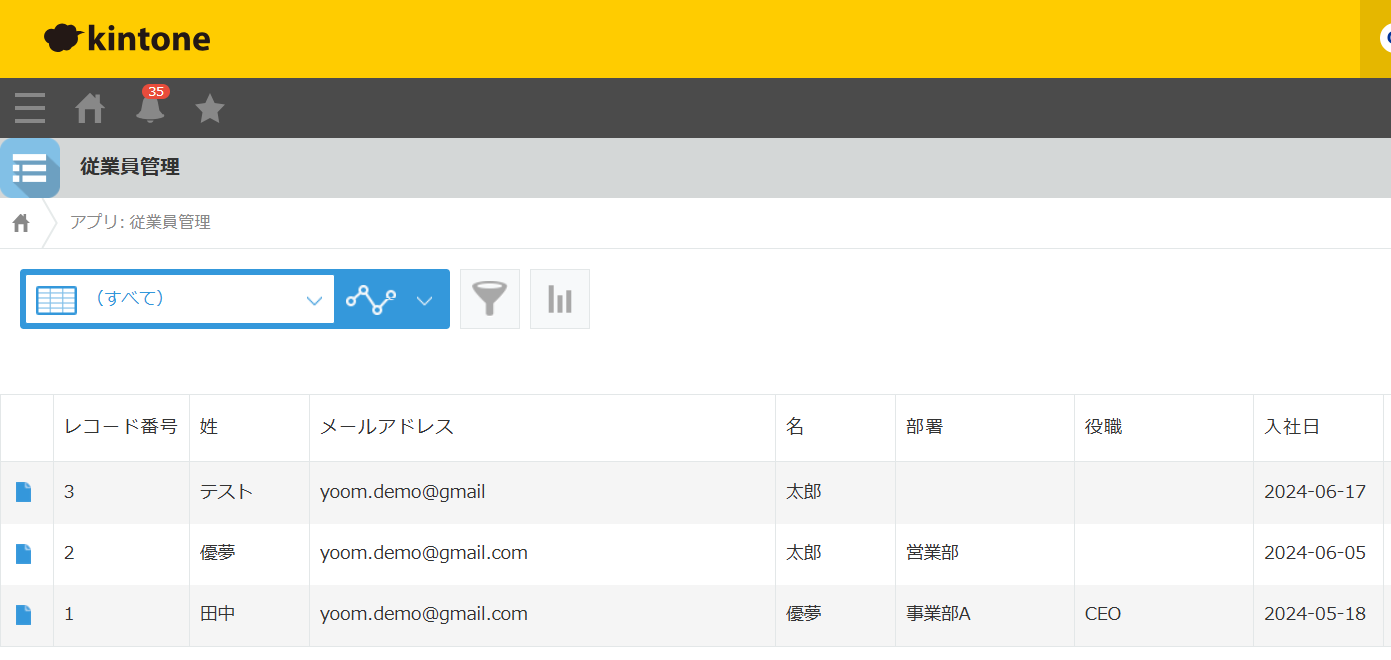 ※今回は、テスト用にkintoneで従業員情報を管理するアプリを作成しました。そのため、アウトプットが上記の内容になっています。