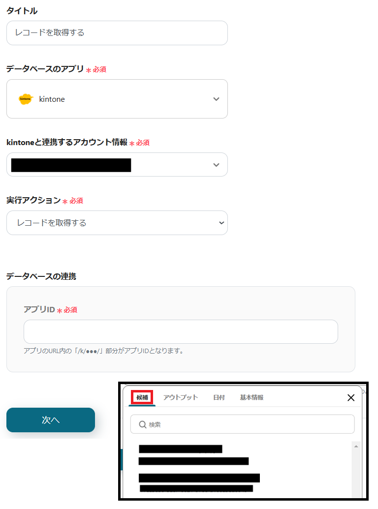 2.kintoneと連携するアカウントを確認し、アプリIDを設定したら次へ進みます。
