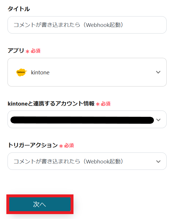 トリガーは、「コメントが書き込まれたら(Webhook起動)」を選択します。