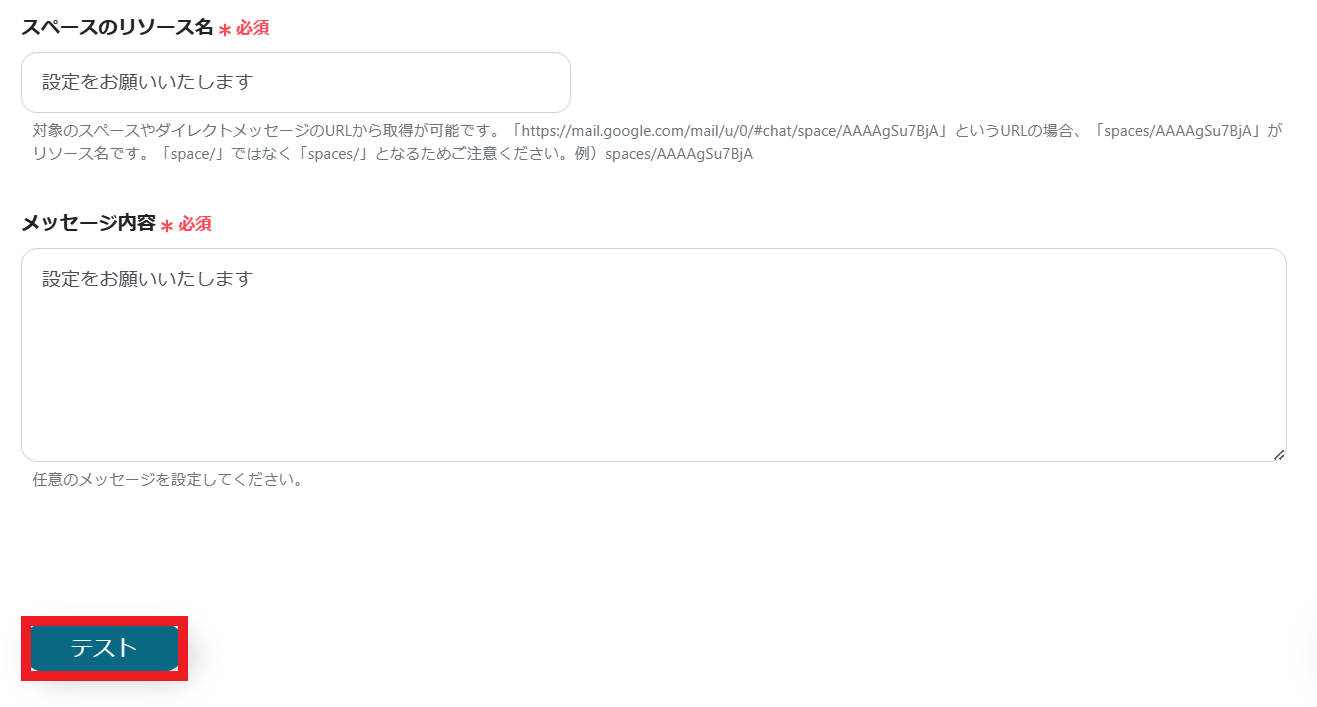 3.スペースのリソース名とメッセージ内容を設定してください。