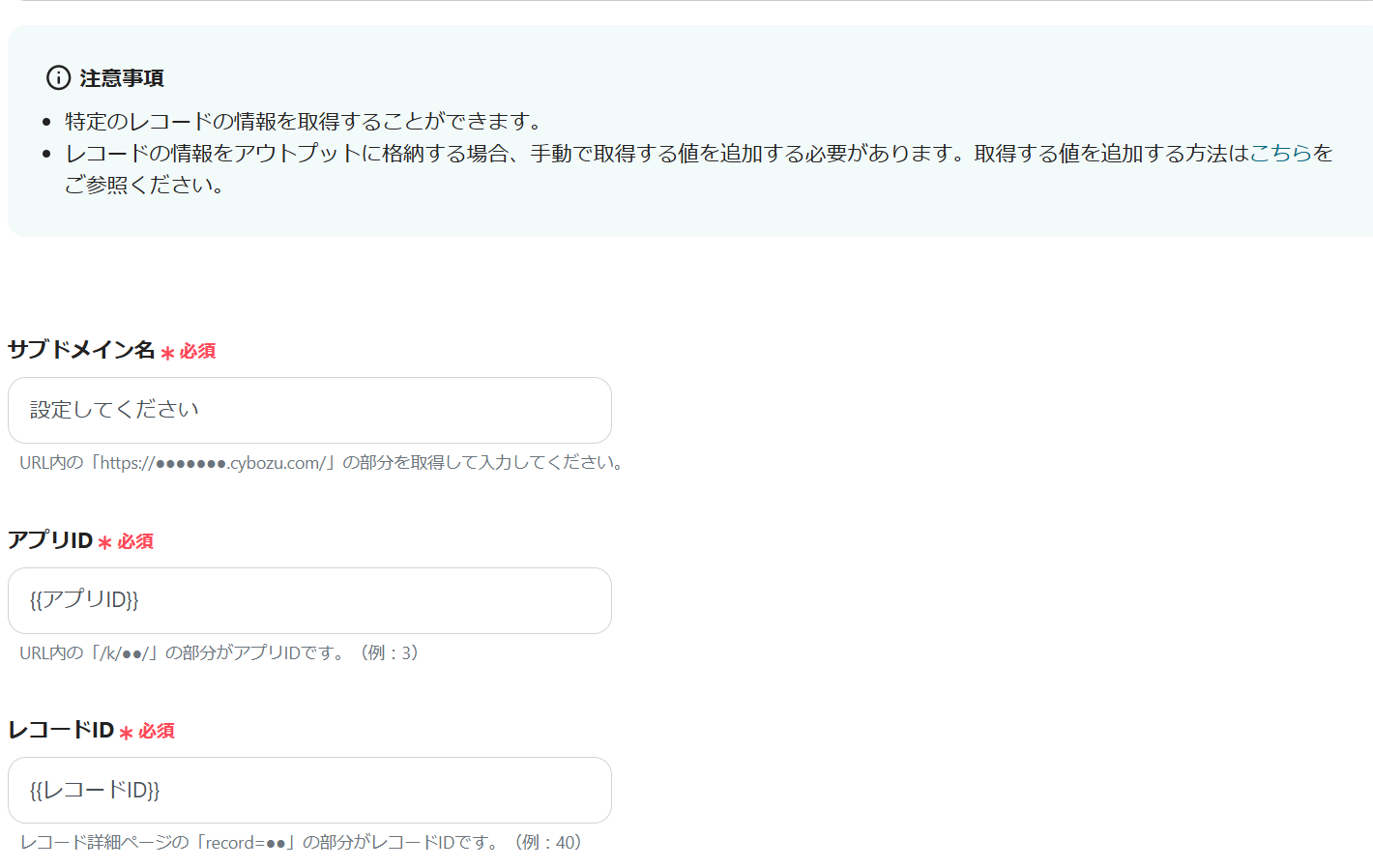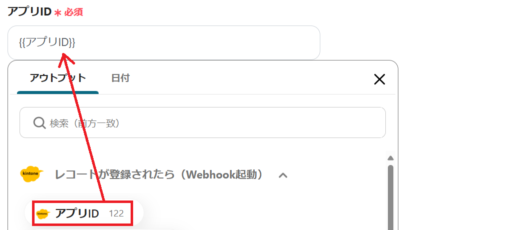フローボットの設定に戻り、テストしてアウトプットにkintoneのアプリIDなどが反映していたら保存します。