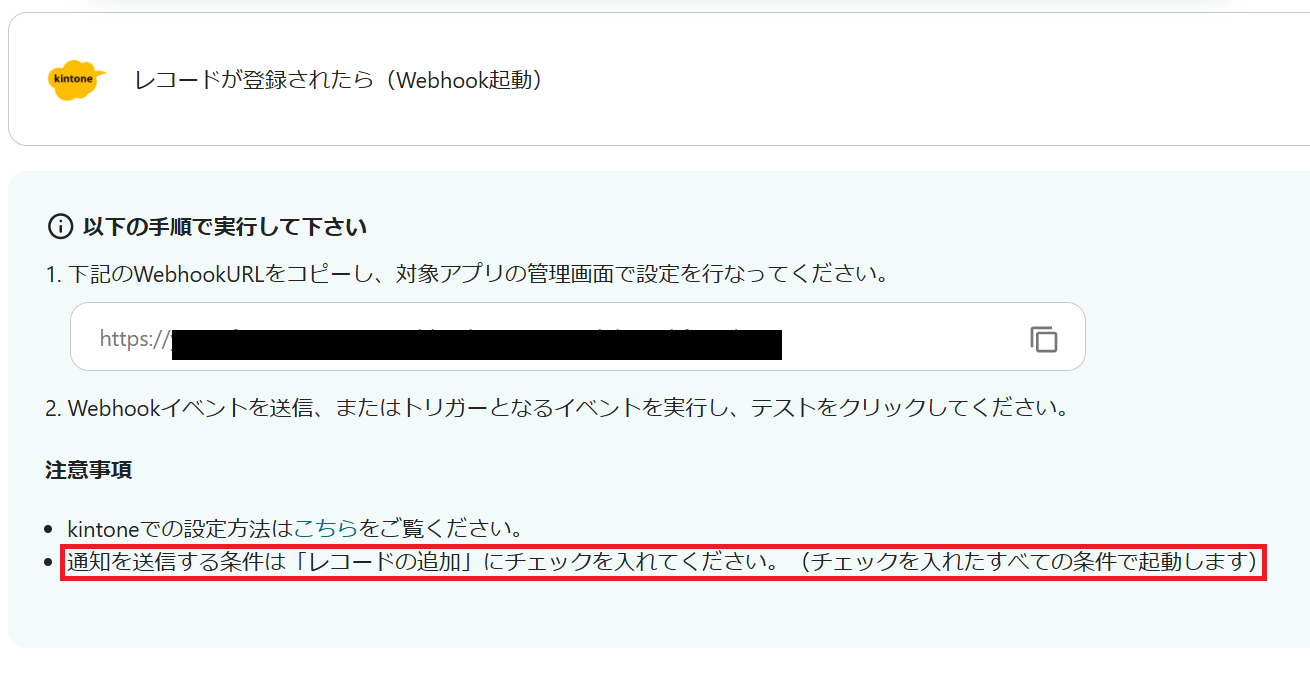 以下の画面でこちらの記事を参考に、アプリトリガーのWebhookイベント受信を設定してください。
