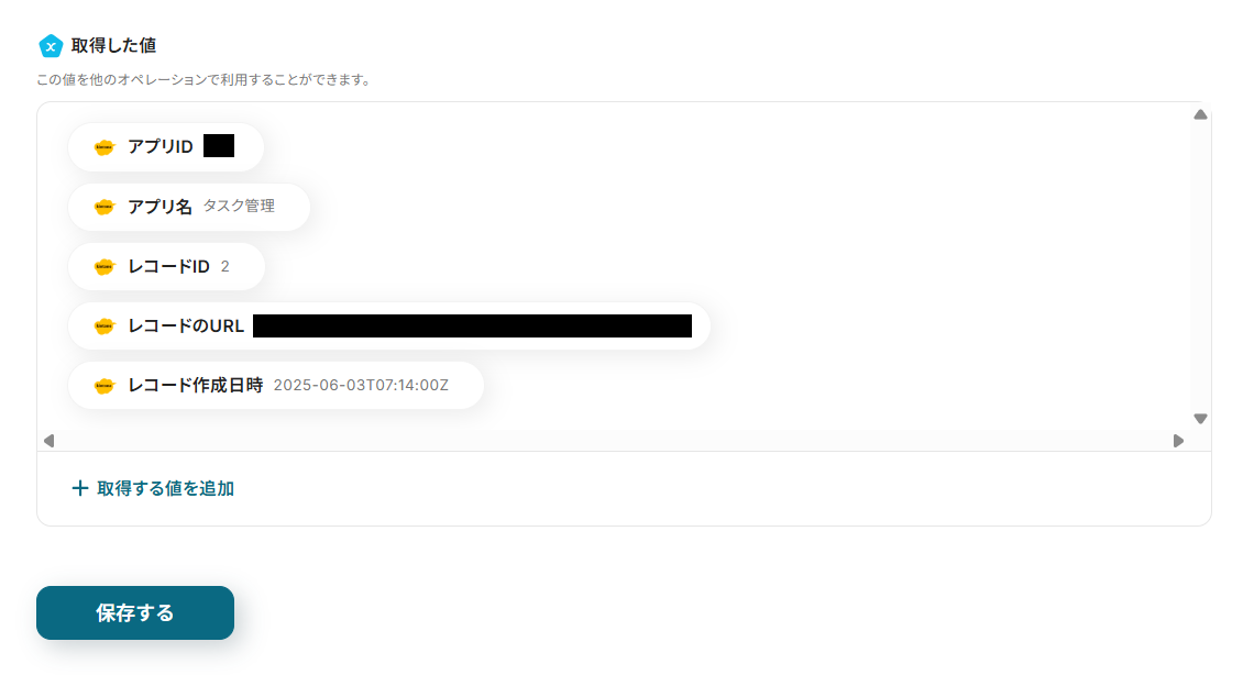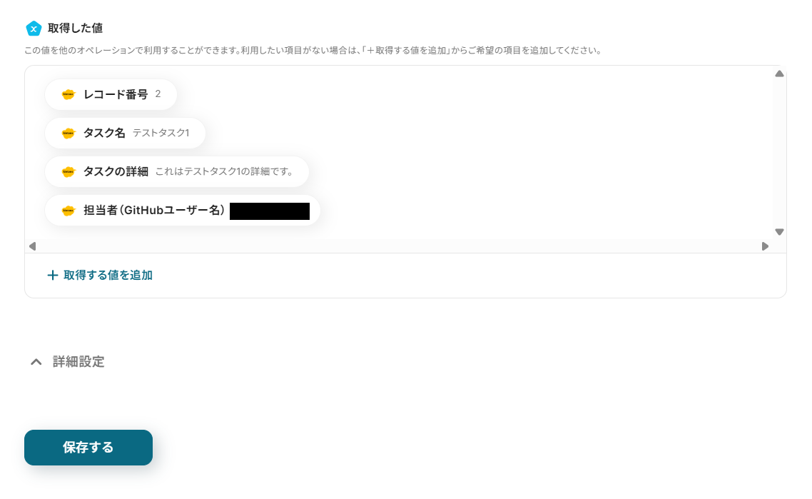 テストが成功すると、kintoneに追加したレコード情報が取得されるので、保存して進んでください。