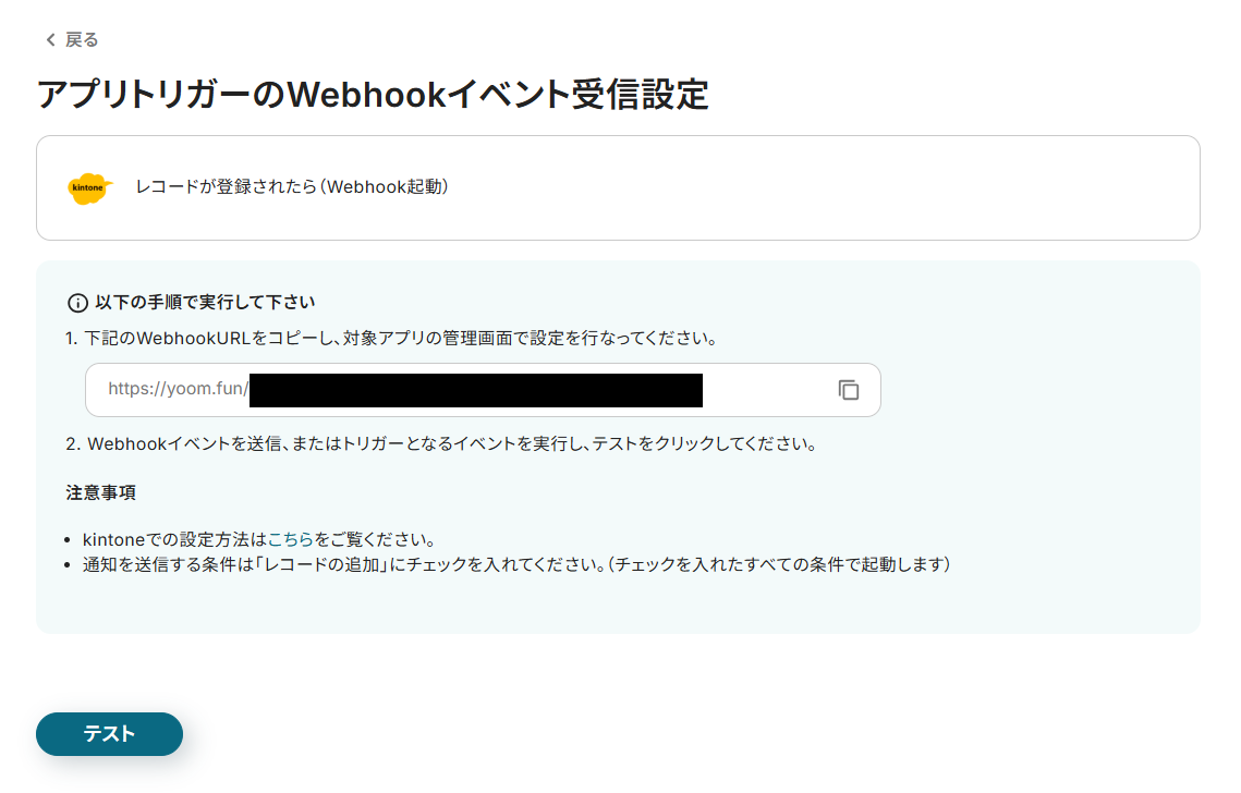 表示されたWebhookURLをコピーし、kintoneの対象のアプリに設定してください。