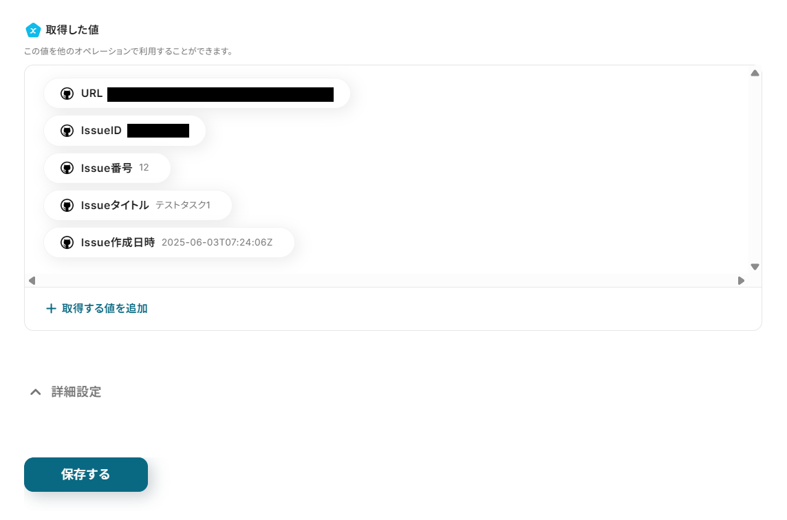 「取得した値」は、以降の設定で利用できます。