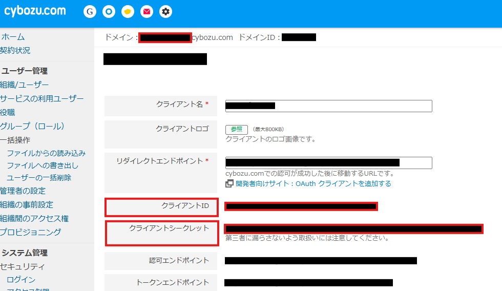 kintoneで以下の画像のように、サブドメイン、クライアントID、クライアントシークレットをコピーしていきます。