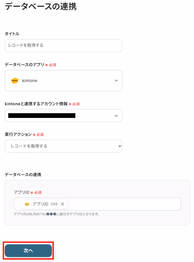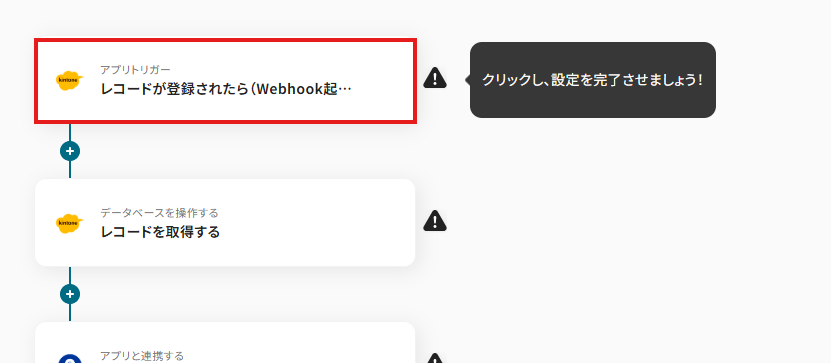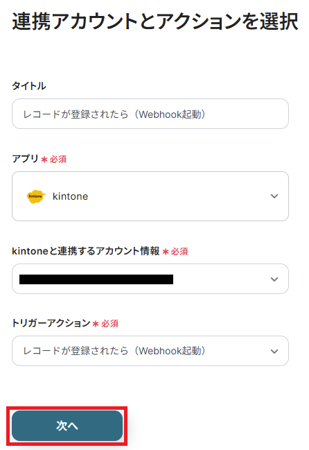 トリガーアクションが「レコードが登録されたら」になっていることを確認して「次へ」をクリックします。