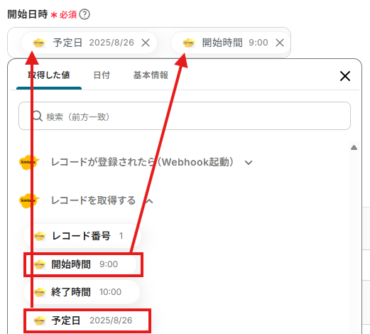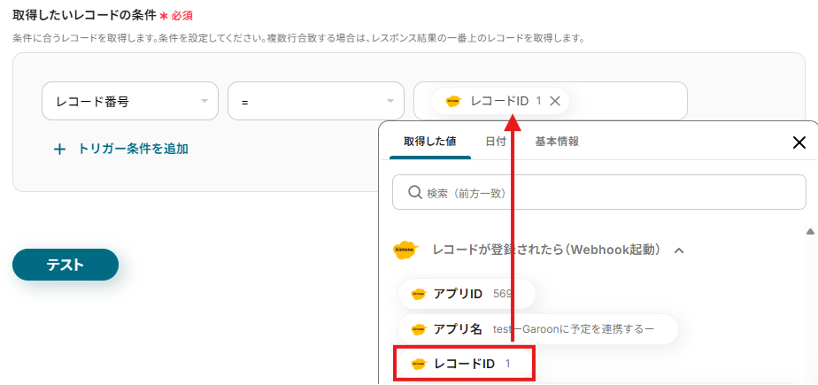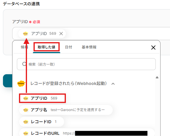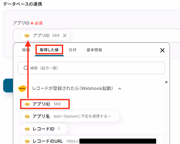 取得した値から「レコードが登録されたら」のプルダウンを開いて「レコードID」を選択します。