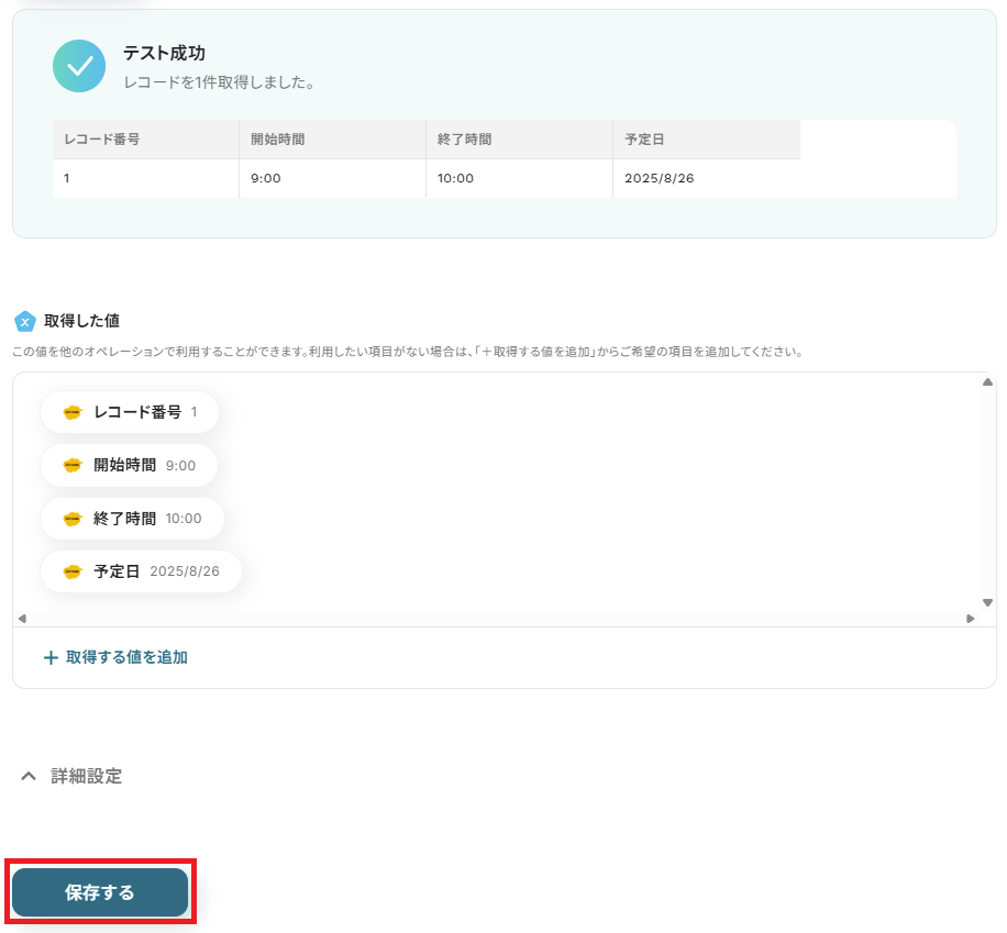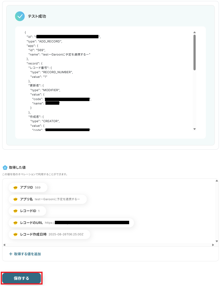 テストが成功したら、取得した値に情報が表示されます。内容を確認し、下部にある「保存する」をクリックします。