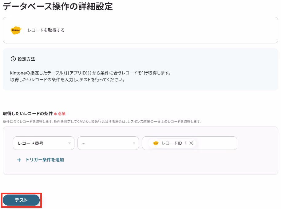 取得したいレコードの条件:レコード番号「=(等しい)」「レコードID」条件を設定します
